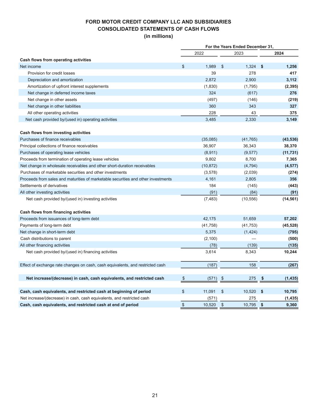 21 FORD MOTOR CREDIT COMPANY LLC AND SUBSIDIARIES CONSOLIDATED STATEMENTS OF CASH FLOWS (in millions) For the Years Ended December 31, 2022 2023 2024 Cash flows from operating activities Net income $ 1,989 $ 1,324 $ 1,256 Provision for credit losses 39 278 417 Depreciation and amortization 2,872 2,900 3,112 Amortization of upfront interest supplements (1,830) (1,795) (2,395) Net change in deferred income taxes 324 (617) 276 Net change in other assets (497) (146) (219) Net change in other liabilities 360 343 327 All other operating activities 228 43 375 Net cash provided by/(used in) operating activities 3,485 2,330 3,149 Cash flows from investing activities Purchases of finance receivables (35,085) (41,765) (43,536) Principal collections of finance receivables 36,907 36,343 38,370 Purchases of operating lease vehicles (8,911) (9,577) (11,731) Proceeds from termination of operating lease vehicles 9,802 8,700 7,365 Net change in wholesale receivables and other short-duration receivables (10,872) (4,794) (4,577) Purchases of marketable securities and other investments (3,578) (2,039) (274) Proceeds from sales and maturities of marketable securities and other investments 4,161 2,805 356 Settlements of derivatives 184 (145) (443) All other investing activities (91) (84) (91) Net cash provided by/(used in) investing activities (7,483) (10,556) (14,561) Cash flows from financing activities Proceeds from issuances of long-term debt 42,175 51,659 57,202 Payments of long-term debt (41,758) (41,753) (45,528) Net change in short-term debt 5,375 (1,424) (795) Cash distributions to parent (2,100) — (500) All other financing activities (78) (139) (135) Net cash provided by/(used in) financing activities 3,614 8,343 10,244 Effect of exchange rate changes on cash, cash equivalents, and restricted cash (187) 158 (267) Net increase/(decrease) in cash, cash equivalents, and restricted cash $ (571) $ 275 $ (1,435) Cash, cash equivalents, and restricted cash at beginning of period $ 11,091 $ 10,520 $ 10,795 Net increase/(decrease) in cash, cash equivalents, and restricted cash (571) 275 (1,435) Cash, cash equivalents, and restricted cash at end of period $ 10,520 $ 10,795 $ 9,360