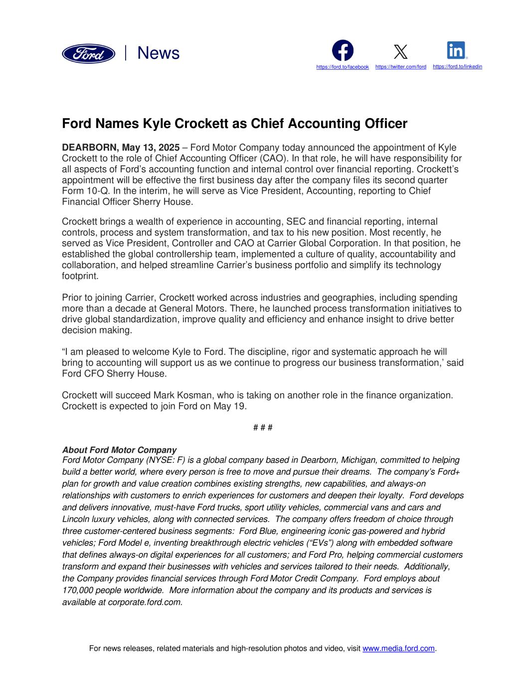 For news releases, related materials and high-resolution photos and video, visit www.media.ford.com. https://twitter.com/ford https://ford.to/facebook https://ford.to/linkedin News Ford Names Kyle Crockett as Chief Accounting Officer DEARBORN, May 13, 2025 – Ford Motor Company today announced the appointment of Kyle Crockett to the role of Chief Accounting Officer (CAO). In that role, he will have responsibility for all aspects of Ford’s accounting function and internal control over financial reporting. Crockett’s appointment will be effective the first business day after the company files its second quarter Form 10-Q. In the interim, he will serve as Vice President, Accounting, reporting to Chief Financial Officer Sherry House. Crockett brings a wealth of experience in accounting, SEC and financial reporting, internal controls, process and system transformation, and tax to his new position. Most recently, he served as Vice President, Controller and CAO at Carrier Global Corporation. In that position, he established the global controllership team, implemented a culture of quality, accountability and collaboration, and helped streamline Carrier’s business portfolio and simplify its technology footprint. Prior to joining Carrier, Crockett worked across industries and geographies, including spending more than a decade at General Motors. There, he launched process transformation initiatives to drive global standardization, improve quality and efficiency and enhance insight to drive better decision making. “I am pleased to welcome Kyle to Ford. The discipline, rigor and systematic approach he will bring to accounting will support us as we continue to progress our business transformation,’ said Ford CFO Sherry House. Crockett will succeed Mark Kosman, who is taking on another role in the finance organization. Crockett is expected to join Ford on May 19. # # # About Ford Motor Company Ford Motor Company (NYSE: F) is a global company based in Dearborn, Michigan, committed to helping build a better world, where every person is free to move and pursue their dreams. The company’s Ford+ plan for growth and value creation combines existing strengths, new capabilities, and always-on relationships with customers to enrich experiences for customers and deepen their loyalty. Ford develops and delivers innovative, must-have Ford trucks, sport utility vehicles, commercial vans and cars and Lincoln luxury vehicles, along with connected services. The company offers freedom of choice through three customer-centered business segments: Ford Blue, engineering iconic gas-powered and hybrid vehicles; Ford Model e, inventing breakthrough electric vehicles (“EVs”) along with embedded software that defines always-on digital experiences for all customers; and Ford Pro, helping commercial customers transform and expand their businesses with vehicles and services tailored to their needs. Additionally, the Company provides financial services through Ford Motor Credit Company. Ford employs about 170,000 people worldwide. More information about the company and its products and services is available at corporate.ford.com.