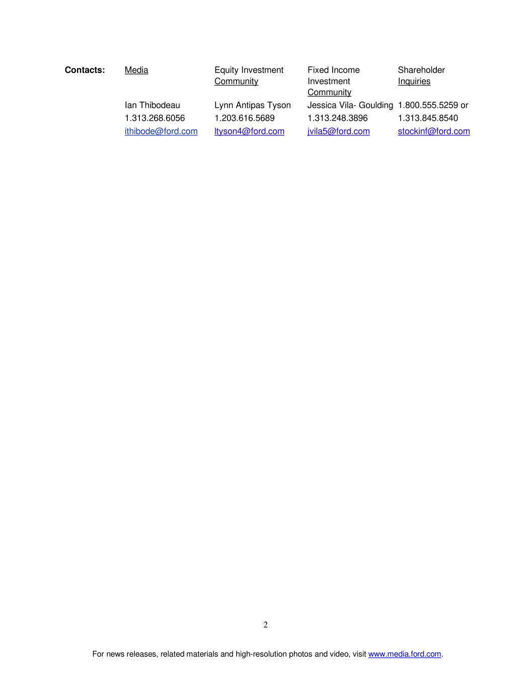 For news releases, related materials and high-resolution photos and video, visit www.media.ford.com. 2 Contacts: Media Equity Investment Community Fixed Income Investment Community Shareholder Inquiries Ian Thibodeau Lynn Antipas Tyson Jessica Vila- Goulding 1.800.555.5259 or 1.313.268.6056 1.203.616.5689 1.313.248.3896 1.313.845.8540 ithibode@ford.com ltyson4@ford.com jvila5@ford.com stockinf@ford.com