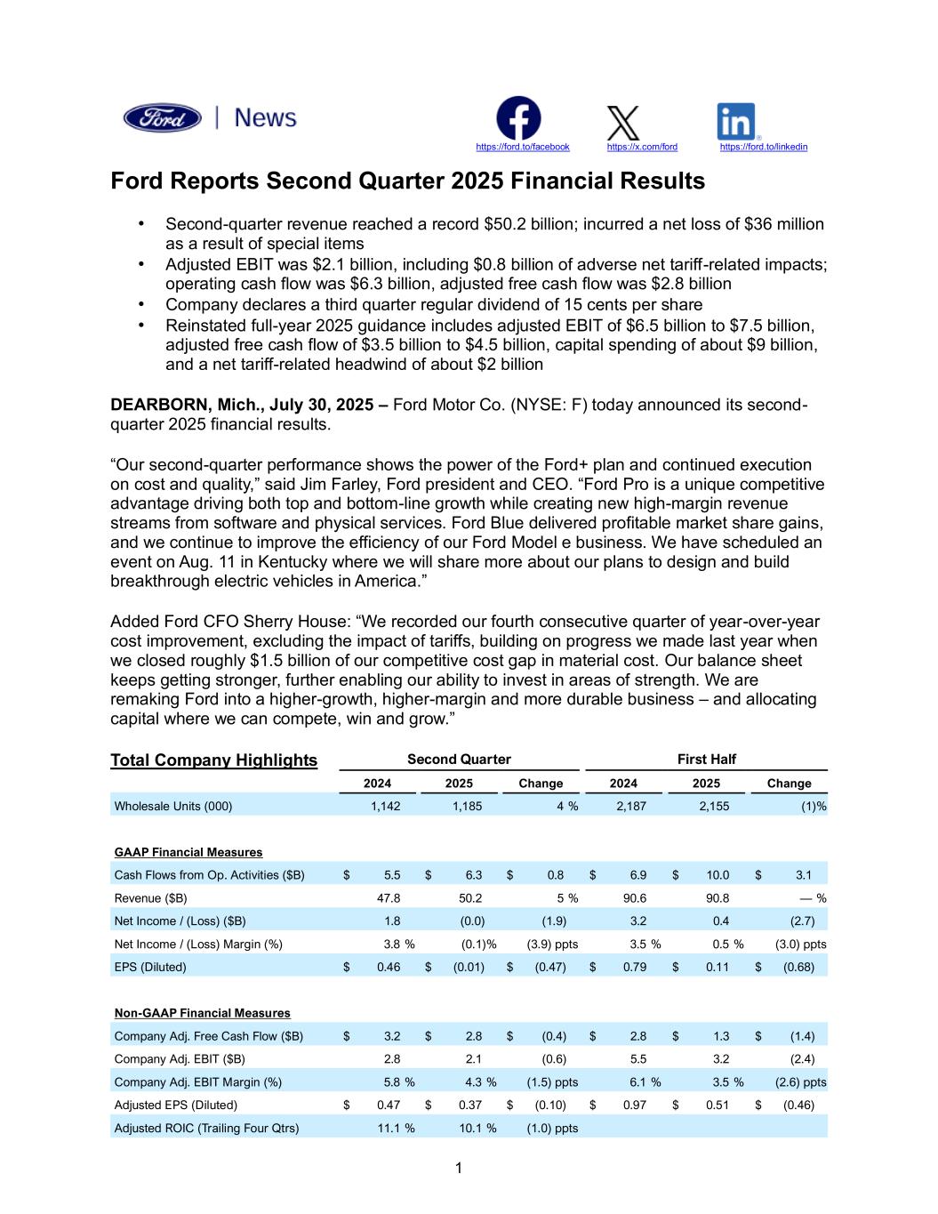 1 https://ford.to/facebook https://x.com/ford https://ford.to/linkedin Ford Reports Second Quarter 2025 Financial Results • Second-quarter revenue reached a record $50.2 billion; incurred a net loss of $36 million as a result of special items • Adjusted EBIT was $2.1 billion, including $0.8 billion of adverse net tariff-related impacts; operating cash flow was $6.3 billion, adjusted free cash flow was $2.8 billion • Company declares a third quarter regular dividend of 15 cents per share • Reinstated full-year 2025 guidance includes adjusted EBIT of $6.5 billion to $7.5 billion, adjusted free cash flow of $3.5 billion to $4.5 billion, capital spending of about $9 billion, and a net tariff-related headwind of about $2 billion DEARBORN, Mich., July 30, 2025 – Ford Motor Co. (NYSE: F) today announced its second- quarter 2025 financial results. “Our second-quarter performance shows the power of the Ford+ plan and continued execution on cost and quality,” said Jim Farley, Ford president and CEO. “Ford Pro is a unique competitive advantage driving both top and bottom-line growth while creating new high-margin revenue streams from software and physical services. Ford Blue delivered profitable market share gains, and we continue to improve the efficiency of our Ford Model e business. We have scheduled an event on Aug. 11 in Kentucky where we will share more about our plans to design and build breakthrough electric vehicles in America.” Added Ford CFO Sherry House: “We recorded our fourth consecutive quarter of year-over-year cost improvement, excluding the impact of tariffs, building on progress we made last year when we closed roughly $1.5 billion of our competitive cost gap in material cost. Our balance sheet keeps getting stronger, further enabling our ability to invest in areas of strength. We are remaking Ford into a higher-growth, higher-margin and more durable business – and allocating capital where we can compete, win and grow.” Total Company Highlights Second Quarter First Half 2024 2025 Change 2024 2025 Change Wholesale Units (000) 1,142 1,185 4 % 2,187 2,155 (1)% GAAP Financial Measures Cash Flows from Op. Activities ($B) $ 5.5 $ 6.3 $ 0.8 $ 6.9 $ 10.0 $ 3.1 Revenue ($B) 47.8 50.2 5 % 90.6 90.8 — % Net Income / (Loss) ($B) 1.8 (0.0) (1.9) 3.2 0.4 (2.7) Net Income / (Loss) Margin (%) 3.8 % (0.1)% (3.9) ppts 3.5 % 0.5 % (3.0) ppts EPS (Diluted) $ 0.46 $ (0.01) $ (0.47) $ 0.79 $ 0.11 $ (0.68) Non-GAAP Financial Measures Company Adj. Free Cash Flow ($B) $ 3.2 $ 2.8 $ (0.4) $ 2.8 $ 1.3 $ (1.4) Company Adj. EBIT ($B) 2.8 2.1 (0.6) 5.5 3.2 (2.4) Company Adj. EBIT Margin (%) 5.8 % 4.3 % (1.5) ppts 6.1 % 3.5 % (2.6) ppts Adjusted EPS (Diluted) $ 0.47 $ 0.37 $ (0.10) $ 0.97 $ 0.51 $ (0.46) Adjusted ROIC (Trailing Four Qtrs) 11.1 % 10.1 % (1.0) ppts