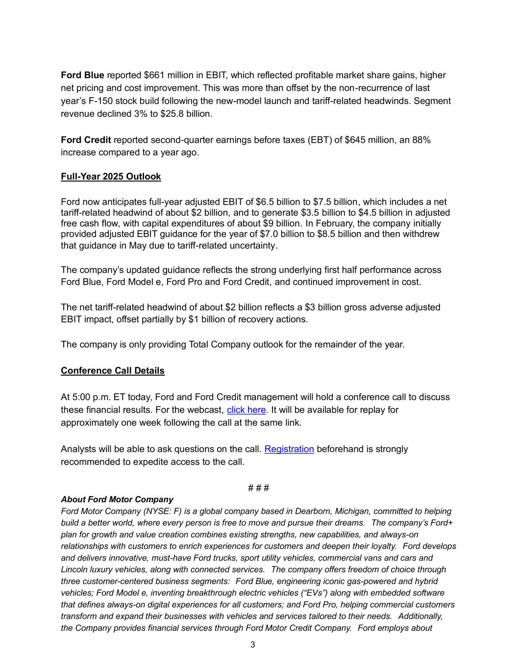 3 Ford Blue reported $661 million in EBIT, which reflected profitable market share gains, higher net pricing and cost improvement. This was more than offset by the non-recurrence of last year’s F-150 stock build following the new-model launch and tariff-related headwinds. Segment revenue declined 3% to $25.8 billion. Ford Credit reported second-quarter earnings before taxes (EBT) of $645 million, an 88% increase compared to a year ago. Full-Year 2025 Outlook Ford now anticipates full-year adjusted EBIT of $6.5 billion to $7.5 billion, which includes a net tariff-related headwind of about $2 billion, and to generate $3.5 billion to $4.5 billion in adjusted free cash flow, with capital expenditures of about $9 billion. In February, the company initially provided adjusted EBIT guidance for the year of $7.0 billion to $8.5 billion and then withdrew that guidance in May due to tariff-related uncertainty. The company’s updated guidance reflects the strong underlying first half performance across Ford Blue, Ford Model e, Ford Pro and Ford Credit, and continued improvement in cost. The net tariff-related headwind of about $2 billion reflects a $3 billion gross adverse adjusted EBIT impact, offset partially by $1 billion of recovery actions. The company is only providing Total Company outlook for the remainder of the year. Conference Call Details At 5:00 p.m. ET today, Ford and Ford Credit management will hold a conference call to discuss these financial results. For the webcast, click here. It will be available for replay for approximately one week following the call at the same link. Analysts will be able to ask questions on the call. Registration beforehand is strongly recommended to expedite access to the call. # # # About Ford Motor Company Ford Motor Company (NYSE: F) is a global company based in Dearborn, Michigan, committed to helping build a better world, where every person is free to move and pursue their dreams. The company’s Ford+ plan for growth and value creation combines existing strengths, new capabilities, and always-on relationships with customers to enrich experiences for customers and deepen their loyalty. Ford develops and delivers innovative, must-have Ford trucks, sport utility vehicles, commercial vans and cars and Lincoln luxury vehicles, along with connected services. The company offers freedom of choice through three customer-centered business segments: Ford Blue, engineering iconic gas-powered and hybrid vehicles; Ford Model e, inventing breakthrough electric vehicles (“EVs”) along with embedded software that defines always-on digital experiences for all customers; and Ford Pro, helping commercial customers transform and expand their businesses with vehicles and services tailored to their needs. Additionally, the Company provides financial services through Ford Motor Credit Company. Ford employs about