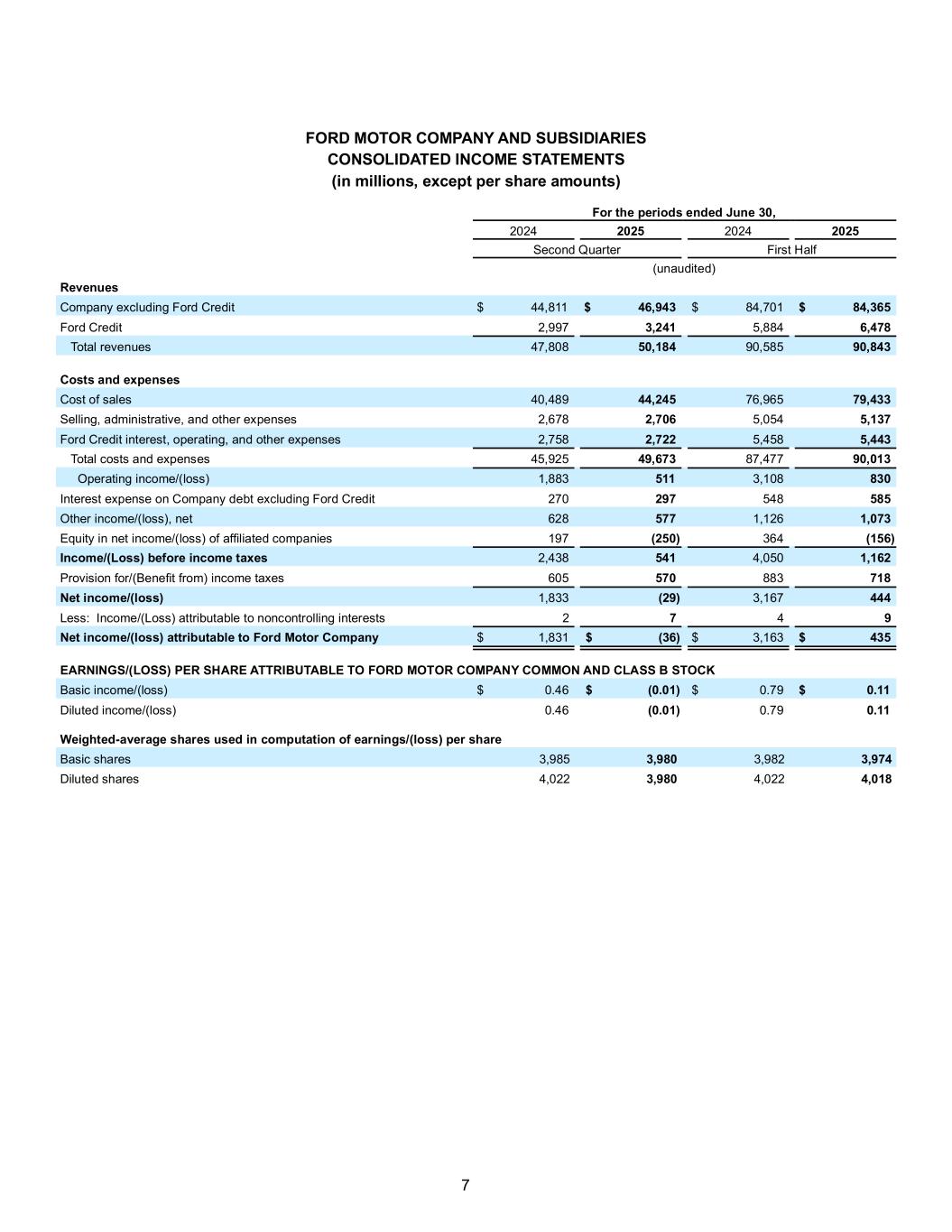 7 FORD MOTOR COMPANY AND SUBSIDIARIES CONSOLIDATED INCOME STATEMENTS (in millions, except per share amounts) For the periods ended June 30, 2024 2025 2024 2025 Second Quarter First Half (unaudited) Revenues Company excluding Ford Credit $ 44,811 $ 46,943 $ 84,701 $ 84,365 Ford Credit 2,997 3,241 5,884 6,478 Total revenues 47,808 50,184 90,585 90,843 Costs and expenses Cost of sales 40,489 44,245 76,965 79,433 Selling, administrative, and other expenses 2,678 2,706 5,054 5,137 Ford Credit interest, operating, and other expenses 2,758 2,722 5,458 5,443 Total costs and expenses 45,925 49,673 87,477 90,013 Operating income/(loss) 1,883 511 3,108 830 Interest expense on Company debt excluding Ford Credit 270 297 548 585 Other income/(loss), net 628 577 1,126 1,073 Equity in net income/(loss) of affiliated companies 197 (250) 364 (156) Income/(Loss) before income taxes 2,438 541 4,050 1,162 Provision for/(Benefit from) income taxes 605 570 883 718 Net income/(loss) 1,833 (29) 3,167 444 Less: Income/(Loss) attributable to noncontrolling interests 2 7 4 9 Net income/(loss) attributable to Ford Motor Company $ 1,831 $ (36) $ 3,163 $ 435 EARNINGS/(LOSS) PER SHARE ATTRIBUTABLE TO FORD MOTOR COMPANY COMMON AND CLASS B STOCK Basic income/(loss) $ 0.46 $ (0.01) $ 0.79 $ 0.11 Diluted income/(loss) 0.46 (0.01) 0.79 0.11 Weighted-average shares used in computation of earnings/(loss) per share Basic shares 3,985 3,980 3,982 3,974 Diluted shares 4,022 3,980 4,022 4,018