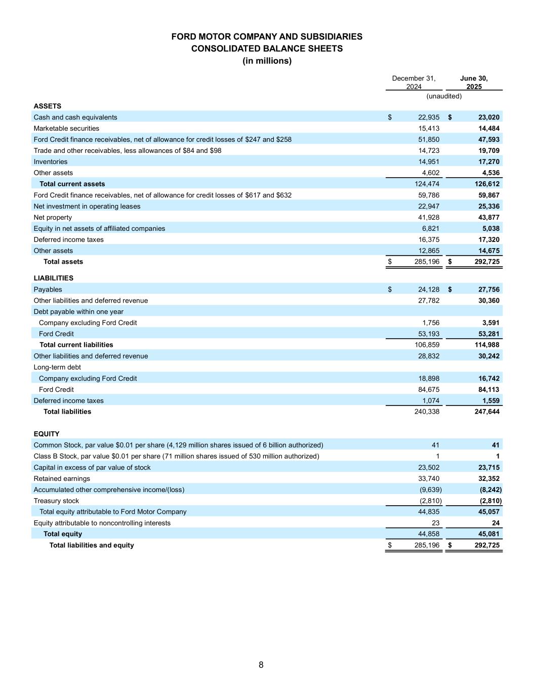 8 FORD MOTOR COMPANY AND SUBSIDIARIES CONSOLIDATED BALANCE SHEETS (in millions) December 31, 2024 June 30, 2025 (unaudited) ASSETS Cash and cash equivalents $ 22,935 $ 23,020 Marketable securities 15,413 14,484 Ford Credit finance receivables, net of allowance for credit losses of $247 and $258 51,850 47,593 Trade and other receivables, less allowances of $84 and $98 14,723 19,709 Inventories 14,951 17,270 Other assets 4,602 4,536 Total current assets 124,474 126,612 Ford Credit finance receivables, net of allowance for credit losses of $617 and $632 59,786 59,867 Net investment in operating leases 22,947 25,336 Net property 41,928 43,877 Equity in net assets of affiliated companies 6,821 5,038 Deferred income taxes 16,375 17,320 Other assets 12,865 14,675 Total assets $ 285,196 $ 292,725 LIABILITIES Payables $ 24,128 $ 27,756 Other liabilities and deferred revenue 27,782 30,360 Debt payable within one year Company excluding Ford Credit 1,756 3,591 Ford Credit 53,193 53,281 Total current liabilities 106,859 114,988 Other liabilities and deferred revenue 28,832 30,242 Long-term debt Company excluding Ford Credit 18,898 16,742 Ford Credit 84,675 84,113 Deferred income taxes 1,074 1,559 Total liabilities 240,338 247,644 EQUITY Common Stock, par value $0.01 per share (4,129 million shares issued of 6 billion authorized) 41 41 Class B Stock, par value $0.01 per share (71 million shares issued of 530 million authorized) 1 1 Capital in excess of par value of stock 23,502 23,715 Retained earnings 33,740 32,352 Accumulated other comprehensive income/(loss) (9,639) (8,242) Treasury stock (2,810) (2,810) Total equity attributable to Ford Motor Company 44,835 45,057 Equity attributable to noncontrolling interests 23 24 Total equity 44,858 45,081 Total liabilities and equity $ 285,196 $ 292,725