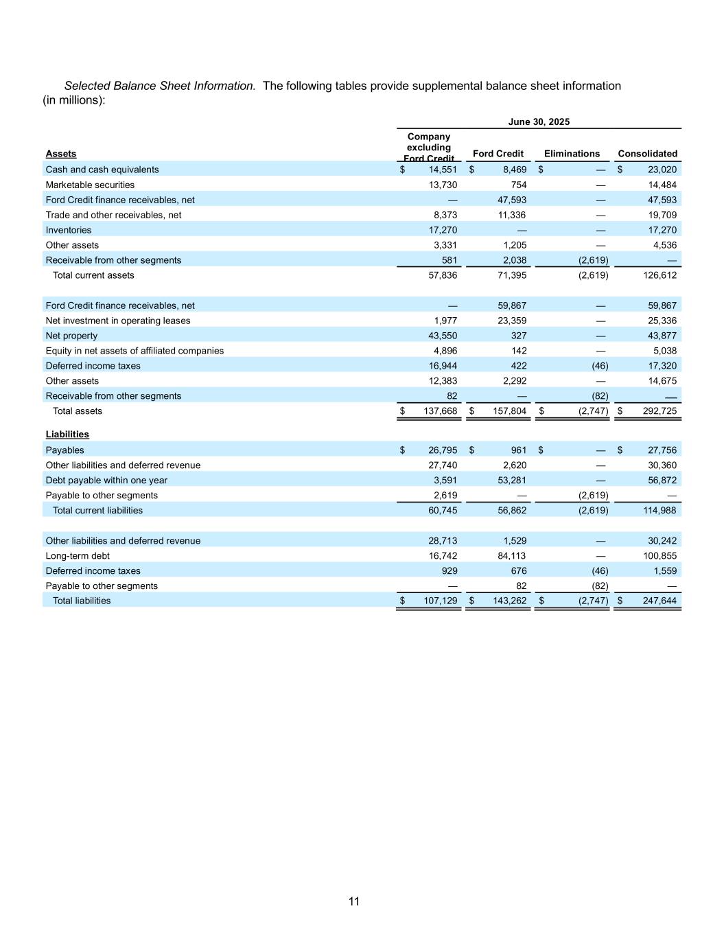 11 Selected Balance Sheet Information. The following tables provide supplemental balance sheet information (in millions): June 30, 2025 Assets Company excluding Ford Credit Ford Credit Eliminations Consolidated Cash and cash equivalents $ 14,551 $ 8,469 $ — $ 23,020 Marketable securities 13,730 754 — 14,484 Ford Credit finance receivables, net — 47,593 — 47,593 Trade and other receivables, net 8,373 11,336 — 19,709 Inventories 17,270 — — 17,270 Other assets 3,331 1,205 — 4,536 Receivable from other segments 581 2,038 (2,619) — Total current assets 57,836 71,395 (2,619) 126,612 Ford Credit finance receivables, net — 59,867 — 59,867 Net investment in operating leases 1,977 23,359 — 25,336 Net property 43,550 327 — 43,877 Equity in net assets of affiliated companies 4,896 142 — 5,038 Deferred income taxes 16,944 422 (46) 17,320 Other assets 12,383 2,292 — 14,675 Receivable from other segments 82 — (82) — Total assets $ 137,668 $ 157,804 $ (2,747) $ 292,725 Liabilities Payables $ 26,795 $ 961 $ — $ 27,756 Other liabilities and deferred revenue 27,740 2,620 — 30,360 Debt payable within one year 3,591 53,281 — 56,872 Payable to other segments 2,619 — (2,619) — Total current liabilities 60,745 56,862 (2,619) 114,988 Other liabilities and deferred revenue 28,713 1,529 — 30,242 Long-term debt 16,742 84,113 — 100,855 Deferred income taxes 929 676 (46) 1,559 Payable to other segments — 82 (82) — Total liabilities $ 107,129 $ 143,262 $ (2,747) $ 247,644