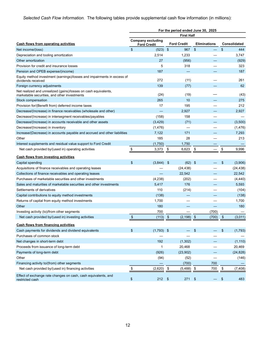 12 Selected Cash Flow Information. The following tables provide supplemental cash flow information (in millions): For the period ended June 30, 2025 First Half Cash flows from operating activities Company excluding Ford Credit Ford Credit Eliminations Consolidated Net income/(loss) $ (523) $ 967 $ — $ 444 Depreciation and tooling amortization 2,514 1,233 — 3,747 Other amortization 27 (956) — (929) Provision for credit and insurance losses 5 318 — 323 Pension and OPEB expense/(income) 187 — — 187 Equity method investment (earnings)/losses and impairments in excess of dividends received 272 (11) — 261 Foreign currency adjustments 139 (77) — 62 Net realized and unrealized (gains)/losses on cash equivalents, marketable securities, and other investments (24) (19) — (43) Stock compensation 265 10 — 275 Provision for/(Benefit from) deferred income taxes 17 195 — 212 Decrease/(Increase) in finance receivables (wholesale and other) — 2,927 — 2,927 Decrease/(Increase) in intersegment receivables/payables (158) 158 — — Decrease/(Increase) in accounts receivable and other assets (3,429) (71) — (3,500) Decrease/(Increase) in inventory (1,476) — — (1,476) Increase/(Decrease) in accounts payable and accrued and other liabilities 7,122 171 — 7,293 Other 185 28 — 213 Interest supplements and residual value support to Ford Credit (1,750) 1,750 — — Net cash provided by/(used in) operating activities $ 3,373 $ 6,623 $ — $ 9,996 Cash flows from investing activities Capital spending $ (3,844) $ (62) $ — $ (3,906) Acquisitions of finance receivables and operating leases — (24,438) — (24,438) Collections of finance receivables and operating leases — 22,542 — 22,542 Purchases of marketable securities and other investments (4,238) (202) — (4,440) Sales and maturities of marketable securities and other investments 5,417 176 — 5,593 Settlements of derivatives 110 (214) — (104) Capital contributions to equity method investments (138) — — (138) Returns of capital from equity method investments 1,700 — — 1,700 Other 180 — — 180 Investing activity (to)/from other segments 700 — (700) — Net cash provided by/(used in) investing activities $ (113) $ (2,198) $ (700) $ (3,011) Cash flows from financing activities Cash payments for dividends and dividend equivalents $ (1,793) $ — $ — $ (1,793) Purchases of common stock — — — — Net changes in short-term debt 192 (1,302) — (1,110) Proceeds from issuance of long-term debt 1 20,468 — 20,469 Payments of long-term debt (926) (23,902) — (24,828) Other (94) (52) — (146) Financing activity to/(from) other segments — (700) 700 — Net cash provided by/(used in) financing activities $ (2,620) $ (5,488) $ 700 $ (7,408) Effect of exchange rate changes on cash, cash equivalents, and restricted cash $ 212 $ 271 $ — $ 483