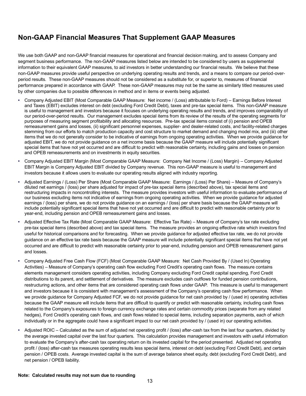 13 Non-GAAP Financial Measures That Supplement GAAP Measures We use both GAAP and non-GAAP financial measures for operational and financial decision making, and to assess Company and segment business performance. The non-GAAP measures listed below are intended to be considered by users as supplemental information to their equivalent GAAP measures, to aid investors in better understanding our financial results. We believe that these non-GAAP measures provide useful perspective on underlying operating results and trends, and a means to compare our period-over- period results. These non-GAAP measures should not be considered as a substitute for, or superior to, measures of financial performance prepared in accordance with GAAP. These non-GAAP measures may not be the same as similarly titled measures used by other companies due to possible differences in method and in items or events being adjusted. • Company Adjusted EBIT (Most Comparable GAAP Measure: Net income / (Loss) attributable to Ford) – Earnings Before Interest and Taxes (EBIT) excludes interest on debt (excluding Ford Credit Debt), taxes and pre-tax special items. This non-GAAP measure is useful to management and investors because it focuses on underlying operating results and trends, and improves comparability of our period-over-period results. Our management excludes special items from its review of the results of the operating segments for purposes of measuring segment profitability and allocating resources. Pre-tax special items consist of (i) pension and OPEB remeasurement gains and losses, (ii) significant personnel expenses, supplier- and dealer-related costs, and facility-related charges stemming from our efforts to match production capacity and cost structure to market demand and changing model mix, and (iii) other items that we do not generally consider to be indicative of earnings from ongoing operating activities. When we provide guidance for adjusted EBIT, we do not provide guidance on a net income basis because the GAAP measure will include potentially significant special items that have not yet occurred and are difficult to predict with reasonable certainty, including gains and losses on pension and OPEB remeasurements and on investments in equity securities. • Company Adjusted EBIT Margin (Most Comparable GAAP Measure: Company Net Income / (Loss) Margin) – Company Adjusted EBIT Margin is Company Adjusted EBIT divided by Company revenue. This non-GAAP measure is useful to management and investors because it allows users to evaluate our operating results aligned with industry reporting. • Adjusted Earnings / (Loss) Per Share (Most Comparable GAAP Measure: Earnings / (Loss) Per Share) – Measure of Company’s diluted net earnings / (loss) per share adjusted for impact of pre-tax special items (described above), tax special items and restructuring impacts in noncontrolling interests. The measure provides investors with useful information to evaluate performance of our business excluding items not indicative of earnings from ongoing operating activities. When we provide guidance for adjusted earnings / (loss) per share, we do not provide guidance on an earnings / (loss) per share basis because the GAAP measure will include potentially significant special items that have not yet occurred and are difficult to predict with reasonable certainty prior to year-end, including pension and OPEB remeasurement gains and losses. • Adjusted Effective Tax Rate (Most Comparable GAAP Measure: Effective Tax Rate) – Measure of Company’s tax rate excluding pre-tax special items (described above) and tax special items. The measure provides an ongoing effective rate which investors find useful for historical comparisons and for forecasting. When we provide guidance for adjusted effective tax rate, we do not provide guidance on an effective tax rate basis because the GAAP measure will include potentially significant special items that have not yet occurred and are difficult to predict with reasonable certainty prior to year-end, including pension and OPEB remeasurement gains and losses. • Company Adjusted Free Cash Flow (FCF) (Most Comparable GAAP Measure: Net Cash Provided By / (Used In) Operating Activities) – Measure of Company’s operating cash flow excluding Ford Credit’s operating cash flows. The measure contains elements management considers operating activities, including Company excluding Ford Credit capital spending, Ford Credit distributions to its parent, and settlement of derivatives. The measure excludes cash outflows for funded pension contributions, restructuring actions, and other items that are considered operating cash flows under GAAP. This measure is useful to management and investors because it is consistent with management’s assessment of the Company’s operating cash flow performance. When we provide guidance for Company Adjusted FCF, we do not provide guidance for net cash provided by / (used in) operating activities because the GAAP measure will include items that are difficult to quantify or predict with reasonable certainty, including cash flows related to the Company's exposures to foreign currency exchange rates and certain commodity prices (separate from any related hedges), Ford Credit's operating cash flows, and cash flows related to special items, including separation payments, each of which individually or in the aggregate could have a significant impact to our net cash provided by / (used in) our operating activities. • Adjusted ROIC – Calculated as the sum of adjusted net operating profit / (loss) after-cash tax from the last four quarters, divided by the average invested capital over the last four quarters. This calculation provides management and investors with useful information to evaluate the Company’s after-cash tax operating return on its invested capital for the period presented. Adjusted net operating profit / (loss) after-cash tax measures operating results less