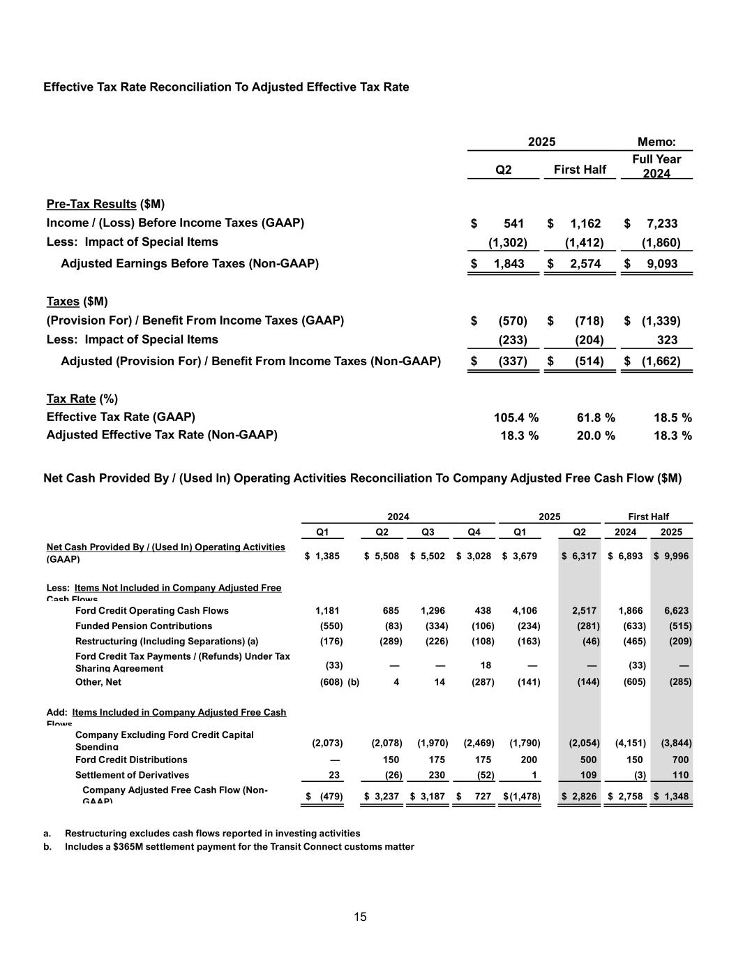14 Net Income / (Loss) Reconciliation to Adjusted EBIT ($M) Second Quarter First Half Memo: 2024 2025 2024 2025 FY 2024 Net Income / (Loss) Attributable to Ford (GAAP) $ 1,831 $ (36) $ 3,163 $ 435 $ 5,879 Income / (Loss) Attributable to Noncontrolling Interests 2 7 4 9 15 Net Income / (Loss) $ 1,833 $ (29) $ 3,167 $ 444 $ 5,894 Less: (Provision For) / Benefit From Income Taxes (605) (570) (883) (718) (1,339) Income / (Loss) Before Income Taxes $ 2,438 $ 541 $ 4,050 $ 1,162 $ 7,233 Less: Special Items Pre-Tax (49) (1,302) (922) (1,412) (1,860) Income / (Loss) Before Special Items Pre-Tax $ 2,487 $ 1,843 $ 4,972 $ 2,574 $ 9,093 Less: Interest on Debt (270) (297) (548) (585) (1,115) Adjusted EBIT (Non-GAAP) $ 2,757 $ 2,140 $ 5,520 $ 3,159 $ 10,208 Memo: Revenue ($B) $ 47.8 $ 50.2 $ 90.6 $ 90.8 $ 185.0 Net Income / (Loss) Margin (GAAP) (%) 3.8 % (0.1)% 3.5 % 0.5 % 3.2 % Adjusted EBIT Margin (Non-GAAP) (%) 5.8 % 4.3 % 6.1 % 3.5 % 5.5 % Earnings / (Loss) Per Share Reconciliation To Adjusted Earnings / (Loss) Per Share Second Quarter First Half 2024 2025 2024 2025 Diluted After-Tax Results ($M) Diluted After-Tax Results (GAAP) $ 1,831 $ (36) $ 3,163 $ 435 Less: Impact of Pre-Tax and Tax Special Items (79) (1,535) (732) (1,616) Adjusted Net Income / (Loss) – Diluted (Non-GAAP) $ 1,910 $ 1,499 $ 3,895 $ 2,051 Basic and Diluted Shares (M) Basic Shares (Average Shares Outstanding) 3,985 3,980 3,982 3,974 Net Dilutive Options, Unvested Restricted Stock Units, Unvested Restricted Stock Shares, and Convertible Debt 37 45 40 44 Diluted Shares 4,022 4,025 4,022 4,018 Earnings / (Loss) Per Share – Diluted (GAAP) (a) $ 0.46 $ (0.01) $ 0.79 $ 0.11 Less: Net Impact of Adjustments (0.01) (0.38) (0.18) (0.40) Adjusted Earnings Per Share – Diluted (Non-GAAP) $ 0.47 $ 0.37 $ 0.97 $ 0.51 a. In the second quarter of 2025, there were 45M shares excluded from the calculation of diluted earnings / (loss) per share, due to their anti- dilutive effect
