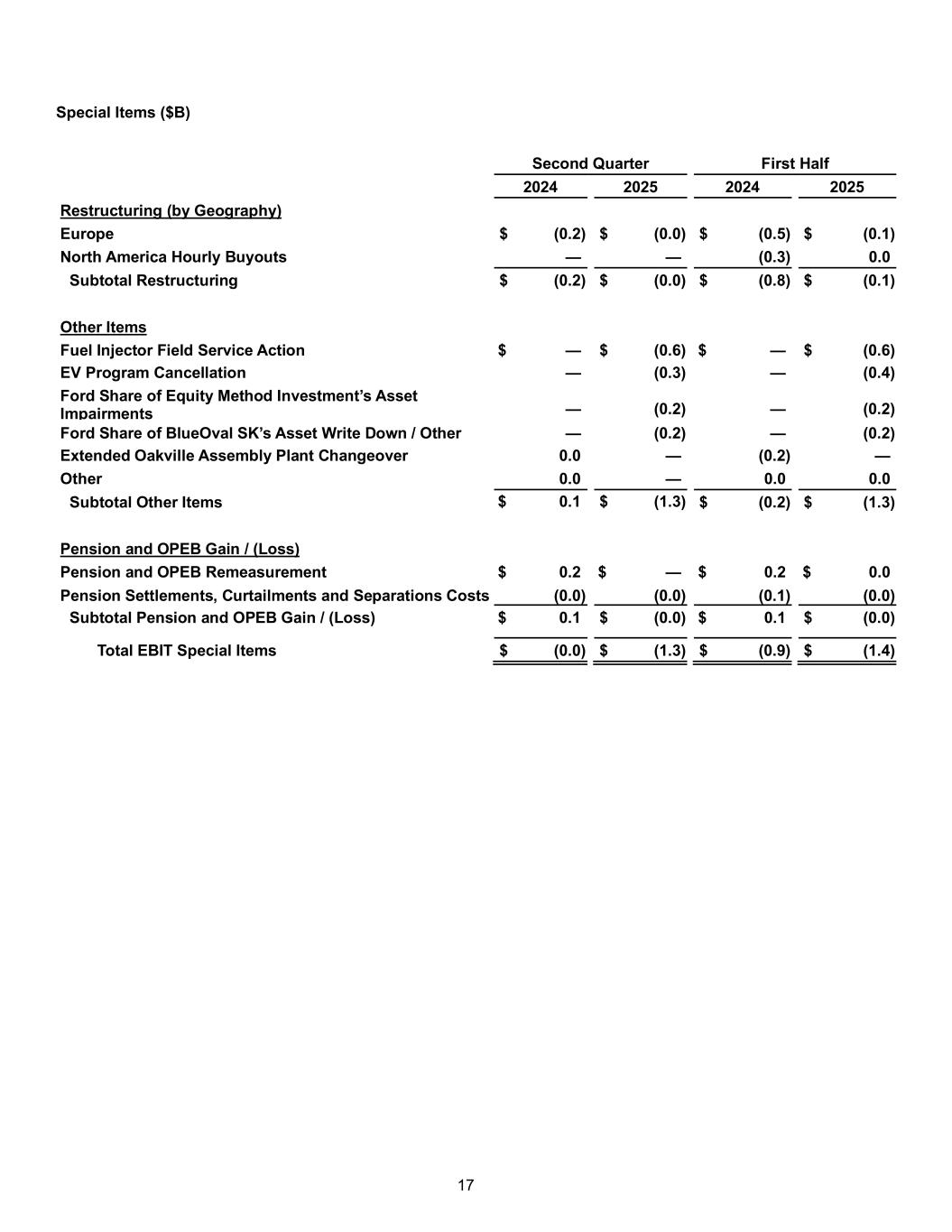 16 Adjusted ROIC ($B) Four Quarters Ending Q2 2024 Four Quarters Ending Q2 2025 Adjusted Net Operating Profit / (Loss) After Cash Tax Net Income / (Loss) Attributable to Ford $ 3.8 $ 3.2 Add: Noncontrolling Interest (0.0) 0.0 Less: Income Tax 0.2 (1.2) Add: Cash Tax (1.2) (0.7) Less: Interest on Debt (1.2) (1.2) Less: Total Pension / OPEB Income / (Cost) (2.6) (0.1) Add: Pension / OPEB Service Costs (0.6) (0.5) Net Operating Profit / (Loss) After Cash Tax $ 5.7 $ 4.4 Less: Special Items (excl. Pension / OPEB) Pre-Tax (2.0) (2.7) Adj. Net Operating Profit / (Loss) After Cash Tax $ 7.7 $ 7.1 Invested Capital Equity $ 43.6 $ 45.1 Debt (excl. Ford Credit) 20.4 20.3 Net Pension and OPEB Liability 6.0 4.3 Invested Capital (End of Period) $ 70.0 $ 69.7 Average Invested Capital $ 69.1 $ 70.2 ROIC (a) 8.2 % 6.3 % Adjusted ROIC (Non-GAAP) (b) 11.1 % 10.1 % a. Calculated as the sum of net operating profit / (loss) after cash tax from the last four quarters, divided by the average invested capital over the last four quarters b. Calculated as the sum of adjusted net operating profit / (loss) after cash tax from the last four quarters, divided by the average invested capital over the last four quarters