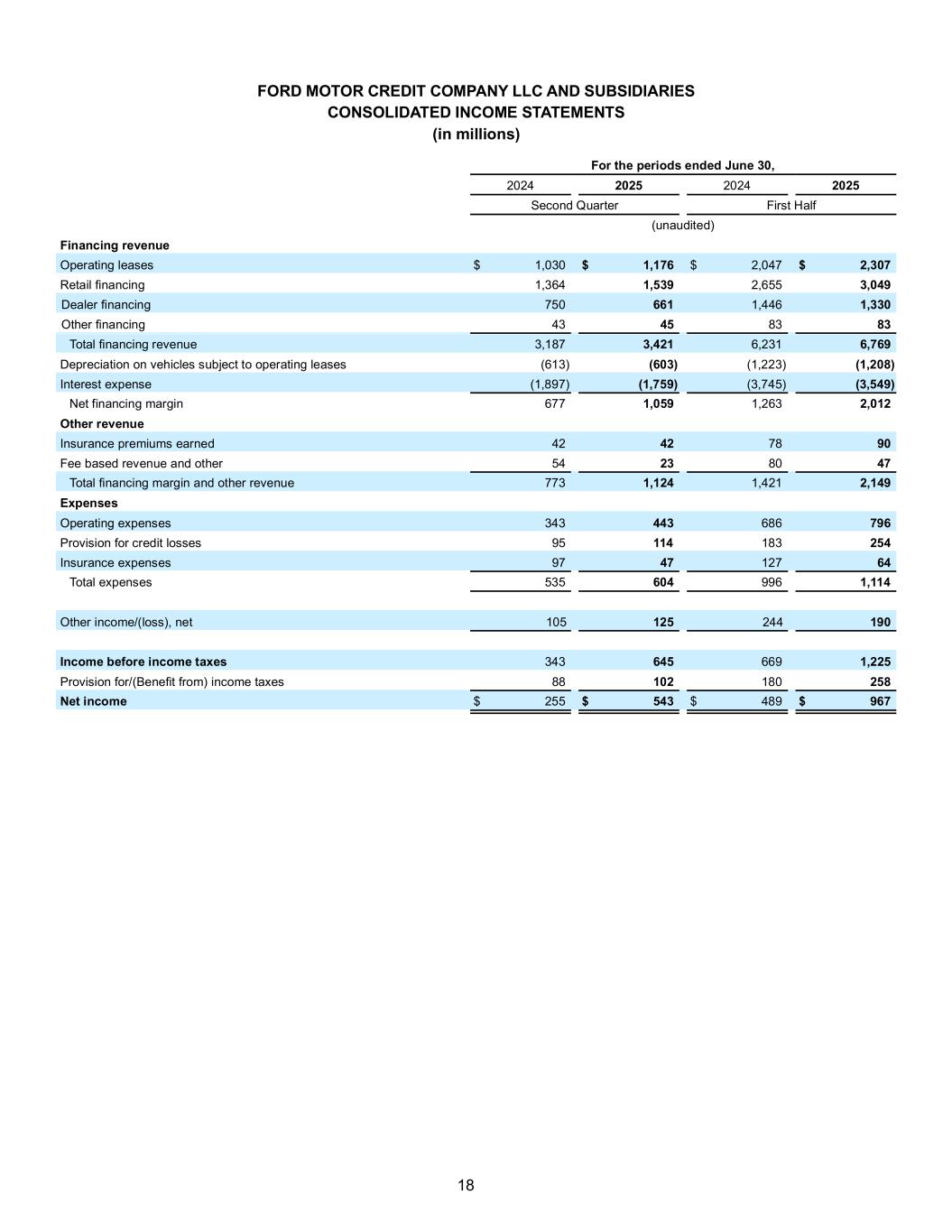18 FORD MOTOR CREDIT COMPANY LLC AND SUBSIDIARIES CONSOLIDATED INCOME STATEMENTS (in millions) For the periods ended June 30, 2024 2025 2024 2025 Second Quarter First Half (unaudited) Financing revenue Operating leases $ 1,030 $ 1,176 $ 2,047 $ 2,307 Retail financing 1,364 1,539 2,655 3,049 Dealer financing 750 661 1,446 1,330 Other financing 43 45 83 83 Total financing revenue 3,187 3,421 6,231 6,769 Depreciation on vehicles subject to operating leases (613) (603) (1,223) (1,208) Interest expense (1,897) (1,759) (3,745) (3,549) Net financing margin 677 1,059 1,263 2,012 Other revenue Insurance premiums earned 42 42 78 90 Fee based revenue and other 54 23 80 47 Total financing margin and other revenue 773 1,124 1,421 2,149 Expenses Operating expenses 343 443 686 796 Provision for credit losses 95 114 183 254 Insurance expenses 97 47 127 64 Total expenses 535 604 996 1,114 Other income/(loss), net 105 125 244 190 Income before income taxes 343 645 669 1,225 Provision for/(Benefit from) income taxes 88 102 180 258 Net income $ 255 $ 543 $ 489 $ 967