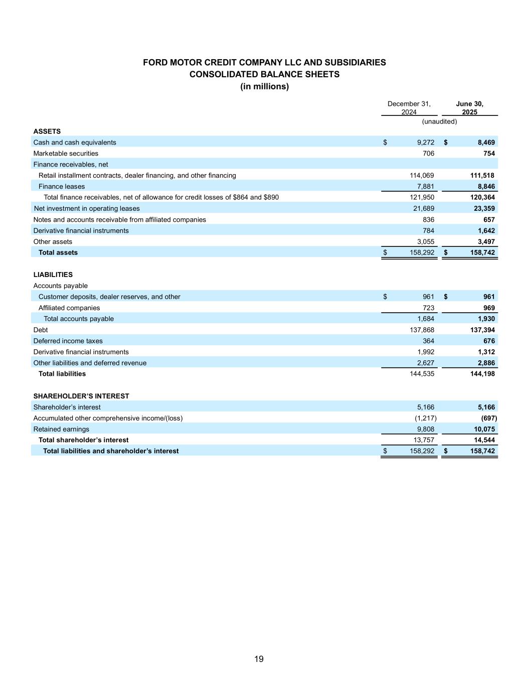 19 FORD MOTOR CREDIT COMPANY LLC AND SUBSIDIARIES CONSOLIDATED BALANCE SHEETS (in millions) December 31, 2024 June 30, 2025 (unaudited) ASSETS Cash and cash equivalents $ 9,272 $ 8,469 Marketable securities 706 754 Finance receivables, net Retail installment contracts, dealer financing, and other financing 114,069 111,518 Finance leases 7,881 8,846 Total finance receivables, net of allowance for credit losses of $864 and $890 121,950 120,364 Net investment in operating leases 21,689 23,359 Notes and accounts receivable from affiliated companies 836 657 Derivative financial instruments 784 1,642 Other assets 3,055 3,497 Total assets $ 158,292 $ 158,742 LIABILITIES Accounts payable Customer deposits, dealer reserves, and other $ 961 $ 961 Affiliated companies 723 969 Total accounts payable 1,684 1,930 Debt 137,868 137,394 Deferred income taxes 364 676 Derivative financial instruments 1,992 1,312 Other liabilities and deferred revenue 2,627 2,886 Total liabilities 144,535 144,198 SHAREHOLDER’S INTEREST Shareholder’s interest 5,166 5,166 Accumulated other comprehensive income/(loss) (1,217) (697) Retained earnings 9,808 10,075 Total shareholder’s interest 13,757 14,544 Total liabilities and shareholder’s interest $ 158,292 $ 158,742