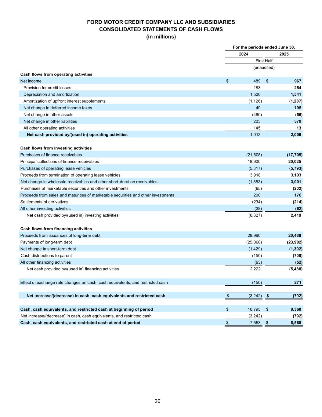 20 FORD MOTOR CREDIT COMPANY LLC AND SUBSIDIARIES CONSOLIDATED STATEMENTS OF CASH FLOWS (in millions) For the periods ended June 30, 2024 2025 First Half (unaudited) Cash flows from operating activities Net income $ 489 $ 967 Provision for credit losses 183 254 Depreciation and amortization 1,530 1,541 Amortization of upfront interest supplements (1,126) (1,287) Net change in deferred income taxes 49 195 Net change in other assets (460) (56) Net change in other liabilities 203 379 All other operating activities 145 13 Net cash provided by/(used in) operating activities 1,013 2,006 Cash flows from investing activities Purchases of finance receivables (21,808) (17,705) Principal collections of finance receivables 18,900 20,025 Purchases of operating lease vehicles (5,317) (5,793) Proceeds from termination of operating lease vehicles 3,918 3,193 Net change in wholesale receivables and other short-duration receivables (1,853) 3,001 Purchases of marketable securities and other investments (95) (202) Proceeds from sales and maturities of marketable securities and other investments 200 176 Settlements of derivatives (234) (214) All other investing activities (38) (62) Net cash provided by/(used in) investing activities (6,327) 2,419 Cash flows from financing activities Proceeds from issuances of long-term debt 28,960 20,468 Payments of long-term debt (25,066) (23,902) Net change in short-term debt (1,429) (1,302) Cash distributions to parent (150) (700) All other financing activities (93) (52) Net cash provided by/(used in) financing activities 2,222 (5,488) Effect of exchange rate changes on cash, cash equivalents, and restricted cash (150) 271 Net increase/(decrease) in cash, cash equivalents and restricted cash $ (3,242) $ (792) Cash, cash equivalents, and restricted cash at beginning of period $ 10,795 $ 9,360 Net increase/(decrease) in cash, cash equivalents, and restricted cash (3,242) (792) Cash, cash equivalents, and restricted cash at end of period $ 7,553 $ 8,568