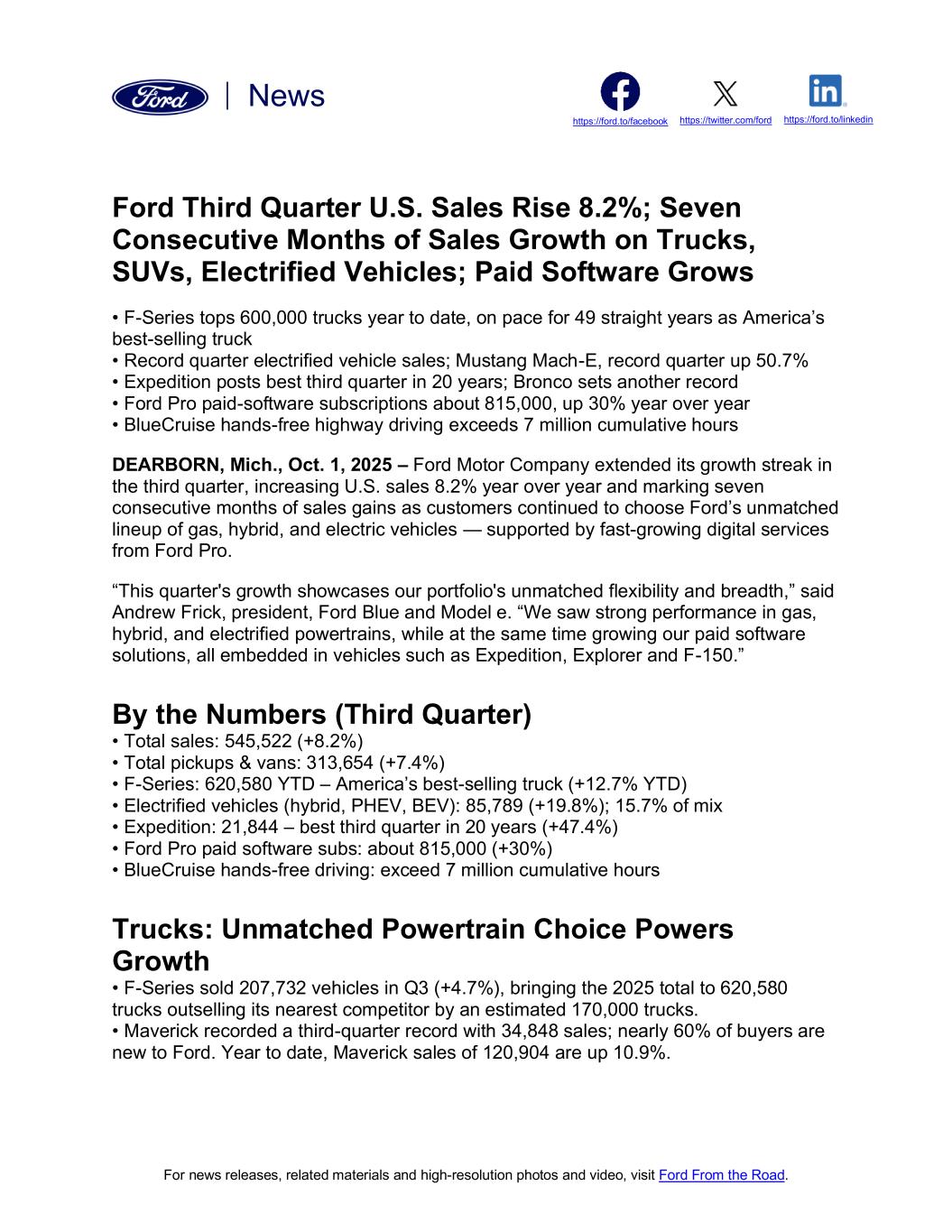 For news releases, related materials and high-resolution photos and video, visit Ford From the Road. https://twitter.com/ford https://ford.to/facebook https://ford.to/linkedin News Ford Third Quarter U.S. Sales Rise 8.2%; Seven Consecutive Months of Sales Growth on Trucks, SUVs, Electrified Vehicles; Paid Software Grows • F-Series tops 600,000 trucks year to date, on pace for 49 straight years as America’s best-selling truck • Record quarter electrified vehicle sales; Mustang Mach-E, record quarter up 50.7% • Expedition posts best third quarter in 20 years; Bronco sets another record • Ford Pro paid-software subscriptions about 815,000, up 30% year over year • BlueCruise hands-free highway driving exceeds 7 million cumulative hours DEARBORN, Mich., Oct. 1, 2025 – Ford Motor Company extended its growth streak in the third quarter, increasing U.S. sales 8.2% year over year and marking seven consecutive months of sales gains as customers continued to choose Ford’s unmatched lineup of gas, hybrid, and electric vehicles — supported by fast-growing digital services from Ford Pro. “This quarter's growth showcases our portfolio's unmatched flexibility and breadth,” said Andrew Frick, president, Ford Blue and Model e. “We saw strong performance in gas, hybrid, and electrified powertrains, while at the same time growing our paid software solutions, all embedded in vehicles such as Expedition, Explorer and F-150.” By the Numbers (Third Quarter) • Total sales: 545,522 (+8.2%) • Total pickups & vans: 313,654 (+7.4%) • F-Series: 620,580 YTD – America’s best-selling truck (+12.7% YTD) • Electrified vehicles (hybrid, PHEV, BEV): 85,789 (+19.8%); 15.7% of mix • Expedition: 21,844 – best third quarter in 20 years (+47.4%) • Ford Pro paid software subs: about 815,000 (+30%) • BlueCruise hands-free driving: exceed 7 million cumulative hours Trucks: Unmatched Powertrain Choice Powers Growth • F-Series sold 207,732 vehicles in Q3 (+4.7%), bringing the 2025 total to 620,580 trucks outselling its nearest competitor by an estimated 170,000 trucks. • Maverick recorded a third-quarter record with 34,848 sales; nearly 60% of buyers are new to Ford. Year to date, Maverick sales of 120,904 are up 10.9%.