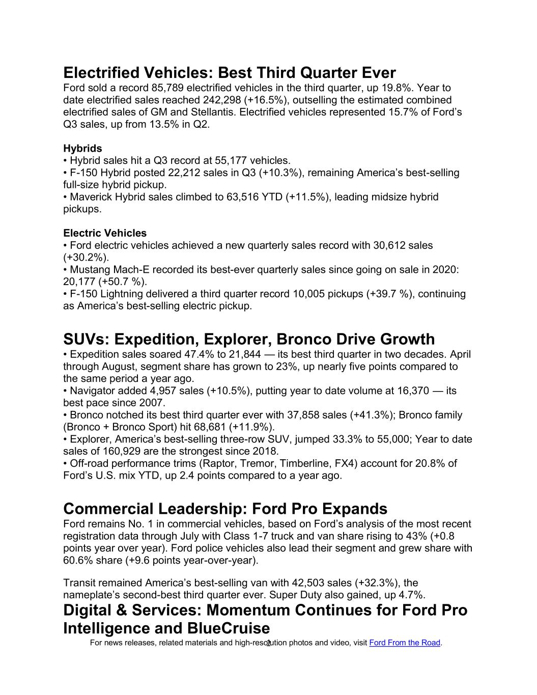 For news releases, related materials and high-resolution photos and video, visit Ford From the Road. 2 Electrified Vehicles: Best Third Quarter Ever Ford sold a record 85,789 electrified vehicles in the third quarter, up 19.8%. Year to date electrified sales reached 242,298 (+16.5%), outselling the estimated combined electrified sales of GM and Stellantis. Electrified vehicles represented 15.7% of Ford’s Q3 sales, up from 13.5% in Q2. Hybrids • Hybrid sales hit a Q3 record at 55,177 vehicles. • F-150 Hybrid posted 22,212 sales in Q3 (+10.3%), remaining America’s best-selling full-size hybrid pickup. • Maverick Hybrid sales climbed to 63,516 YTD (+11.5%), leading midsize hybrid pickups. Electric Vehicles • Ford electric vehicles achieved a new quarterly sales record with 30,612 sales (+30.2%). • Mustang Mach-E recorded its best-ever quarterly sales since going on sale in 2020: 20,177 (+50.7 %). • F-150 Lightning delivered a third quarter record 10,005 pickups (+39.7 %), continuing as America’s best-selling electric pickup. SUVs: Expedition, Explorer, Bronco Drive Growth • Expedition sales soared 47.4% to 21,844 — its best third quarter in two decades. April through August, segment share has grown to 23%, up nearly five points compared to the same period a year ago. • Navigator added 4,957 sales (+10.5%), putting year to date volume at 16,370 — its best pace since 2007. • Bronco notched its best third quarter ever with 37,858 sales (+41.3%); Bronco family (Bronco + Bronco Sport) hit 68,681 (+11.9%). • Explorer, America’s best-selling three-row SUV, jumped 33.3% to 55,000; Year to date sales of 160,929 are the strongest since 2018. • Off-road performance trims (Raptor, Tremor, Timberline, FX4) account for 20.8% of Ford’s U.S. mix YTD, up 2.4 points compared to a year ago. Commercial Leadership: Ford Pro Expands Ford remains No. 1 in commercial vehicles, based on Ford’s analysis of the most recent registration data through July with Class 1-7 truck and van share rising to 43% (+0.8 points year over year). Ford police vehicles also lead their segment and grew share with 60.6% share (+9.6 points year-over-year). Transit remained America’s best-selling van with 42,503 sales (+32.3%), the nameplate’s second-best third quarter ever. Super Duty also gained, up 4.7%. Digital & Services: Momentum Continues for Ford Pro Intelligence and BlueCruise