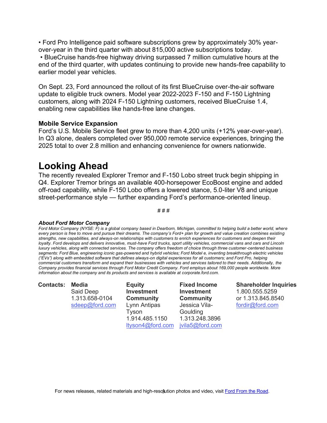 For news releases, related materials and high-resolution photos and video, visit Ford From the Road. 3 • Ford Pro Intelligence paid software subscriptions grew by approximately 30% year- over-year in the third quarter with about 815,000 active subscriptions today. • BlueCruise hands-free highway driving surpassed 7 million cumulative hours at the end of the third quarter, with updates continuing to provide new hands-free capability to earlier model year vehicles. On Sept. 23, Ford announced the rollout of its first BlueCruise over-the-air software update to eligible truck owners. Model year 2022-2023 F-150 and F-150 Lightning customers, along with 2024 F-150 Lightning customers, received BlueCruise 1.4, enabling new capabilities like hands-free lane changes. Mobile Service Expansion Ford’s U.S. Mobile Service fleet grew to more than 4,200 units (+12% year-over-year). In Q3 alone, dealers completed over 950,000 remote service experiences, bringing the 2025 total to over 2.8 million and enhancing convenience for owners nationwide. Looking Ahead The recently revealed Explorer Tremor and F-150 Lobo street truck begin shipping in Q4. Explorer Tremor brings an available 400-horsepower EcoBoost engine and added off-road capability, while F-150 Lobo offers a lowered stance, 5.0-liter V8 and unique street-performance style — further expanding Ford’s performance-oriented lineup. # # # About Ford Motor Company Ford Motor Company (NYSE: F) is a global company based in Dearborn, Michigan, committed to helping build a better world, where every person is free to move and pursue their dreams. The company’s Ford+ plan for growth and value creation combines existing strengths, new capabilities, and always-on relationships with customers to enrich experiences for customers and deepen their loyalty. Ford develops and delivers innovative, must-have Ford trucks, sport utility vehicles, commercial vans and cars and Lincoln luxury vehicles, along with connected services. The company offers freedom of choice through three customer-centered business segments: Ford Blue, engineering iconic gas-powered and hybrid vehicles; Ford Model e, inventing breakthrough electric vehicles (“EVs”) along with embedded software that defines always-on digital experiences for all customers; and Ford Pro, helping commercial customers transform and expand their businesses with vehicles and services tailored to their needs. Additionally, the Company provides financial services through Ford Motor Credit Company. Ford employs about 169,000 people worldwide. More information about the company and its products and services is available at corporate.ford.com. Contacts: Media Said Deep 1.313.658-0104 sdeep@ford.com Equity Investment Community Lynn Antipas Tyson 1.914.485.1150 ltyson4@ford.com Fixed Income Investment Community Jessica Vila- Goulding 1.313.248.3896 jvila5@ford.com Shareholder Inquiries 1.800.555.5259 or 1.313.845.8540 fordir@ford.com
