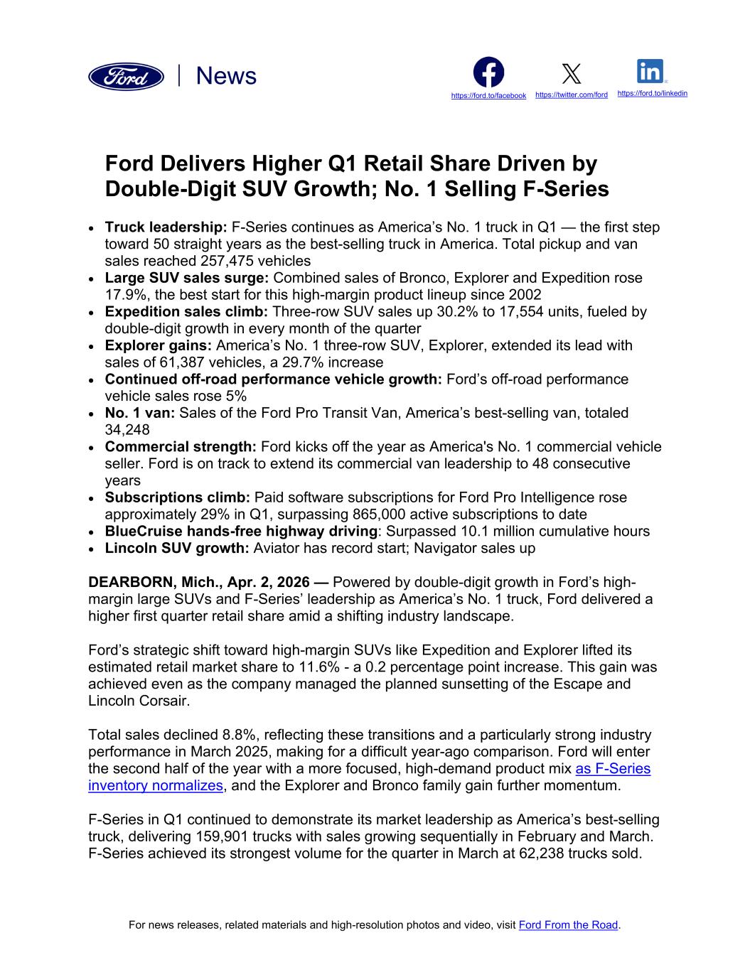 For news releases, related materials and high-resolution photos and video, visit Ford From the Road. https://twitter.com/ford https://ford.to/facebook https://ford.to/linkedin News Ford Delivers Higher Q1 Retail Share Driven by Double-Digit SUV Growth; No. 1 Selling F-Series • Truck leadership: F-Series continues as America’s No. 1 truck in Q1 — the first step toward 50 straight years as the best-selling truck in America. Total pickup and van sales reached 257,475 vehicles • Large SUV sales surge: Combined sales of Bronco, Explorer and Expedition rose 17.9%, the best start for this high-margin product lineup since 2002 • Expedition sales climb: Three-row SUV sales up 30.2% to 17,554 units, fueled by double-digit growth in every month of the quarter • Explorer gains: America’s No. 1 three-row SUV, Explorer, extended its lead with sales of 61,387 vehicles, a 29.7% increase • Continued off-road performance vehicle growth: Ford’s off-road performance vehicle sales rose 5% • No. 1 van: Sales of the Ford Pro Transit Van, America’s best-selling van, totaled 34,248 • Commercial strength: Ford kicks off the year as America's No. 1 commercial vehicle seller. Ford is on track to extend its commercial van leadership to 48 consecutive years • Subscriptions climb: Paid software subscriptions for Ford Pro Intelligence rose approximately 29% in Q1, surpassing 865,000 active subscriptions to date • BlueCruise hands-free highway driving: Surpassed 10.1 million cumulative hours • Lincoln SUV growth: Aviator has record start; Navigator sales up DEARBORN, Mich., Apr. 2, 2026 — Powered by double-digit growth in Ford’s high- margin large SUVs and F-Series’ leadership as America’s No. 1 truck, Ford delivered a higher first quarter retail share amid a shifting industry landscape. Ford’s strategic shift toward high-margin SUVs like Expedition and Explorer lifted its estimated retail market share to 11.6% - a 0.2 percentage point increase. This gain was achieved even as the company managed the planned sunsetting of the Escape and Lincoln Corsair. Total sales declined 8.8%, reflecting these transitions and a particularly strong industry performance in March 2025, making for a difficult year-ago comparison. Ford will enter the second half of the year with a more focused, high-demand product mix as F-Series inventory normalizes, and the Explorer and Bronco family gain further momentum. F-Series in Q1 continued to demonstrate its market leadership as America’s best-selling truck, delivering 159,901 trucks with sales growing sequentially in February and March. F-Series achieved its strongest volume for the quarter in March at 62,238 trucks sold.
