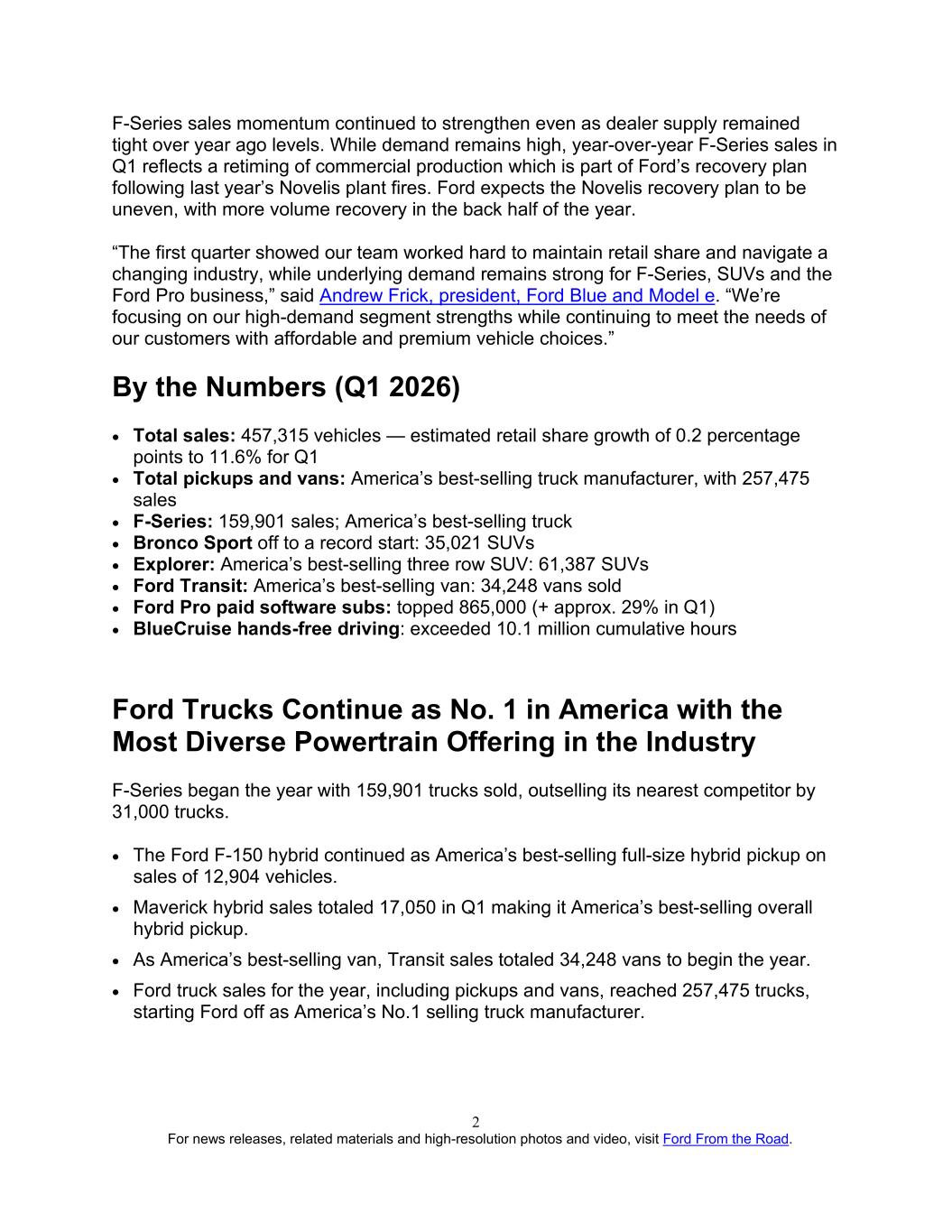 For news releases, related materials and high-resolution photos and video, visit Ford From the Road. 2 F-Series sales momentum continued to strengthen even as dealer supply remained tight over year ago levels. While demand remains high, year-over-year F-Series sales in Q1 reflects a retiming of commercial production which is part of Ford’s recovery plan following last year’s Novelis plant fires. Ford expects the Novelis recovery plan to be uneven, with more volume recovery in the back half of the year. “The first quarter showed our team worked hard to maintain retail share and navigate a changing industry, while underlying demand remains strong for F-Series, SUVs and the Ford Pro business,” said Andrew Frick, president, Ford Blue and Model e. “We’re focusing on our high-demand segment strengths while continuing to meet the needs of our customers with affordable and premium vehicle choices.” By the Numbers (Q1 2026) • Total sales: 457,315 vehicles — estimated retail share growth of 0.2 percentage points to 11.6% for Q1 • Total pickups and vans: America’s best-selling truck manufacturer, with 257,475 sales • F-Series: 159,901 sales; America’s best-selling truck • Bronco Sport off to a record start: 35,021 SUVs • Explorer: America’s best-selling three row SUV: 61,387 SUVs • Ford Transit: America’s best-selling van: 34,248 vans sold • Ford Pro paid software subs: topped 865,000 (+ approx. 29% in Q1) • BlueCruise hands-free driving: exceeded 10.1 million cumulative hours Ford Trucks Continue as No. 1 in America with the Most Diverse Powertrain Offering in the Industry F-Series began the year with 159,901 trucks sold, outselling its nearest competitor by 31,000 trucks. • The Ford F-150 hybrid continued as America’s best-selling full-size hybrid pickup on sales of 12,904 vehicles. • Maverick hybrid sales totaled 17,050 in Q1 making it America’s best-selling overall hybrid pickup. • As America’s best-selling van, Transit sales totaled 34,248 vans to begin the year. • Ford truck sales for the year, including pickups and vans, reached 257,475 trucks, starting Ford off as America’s No.1 selling truck manufacturer.