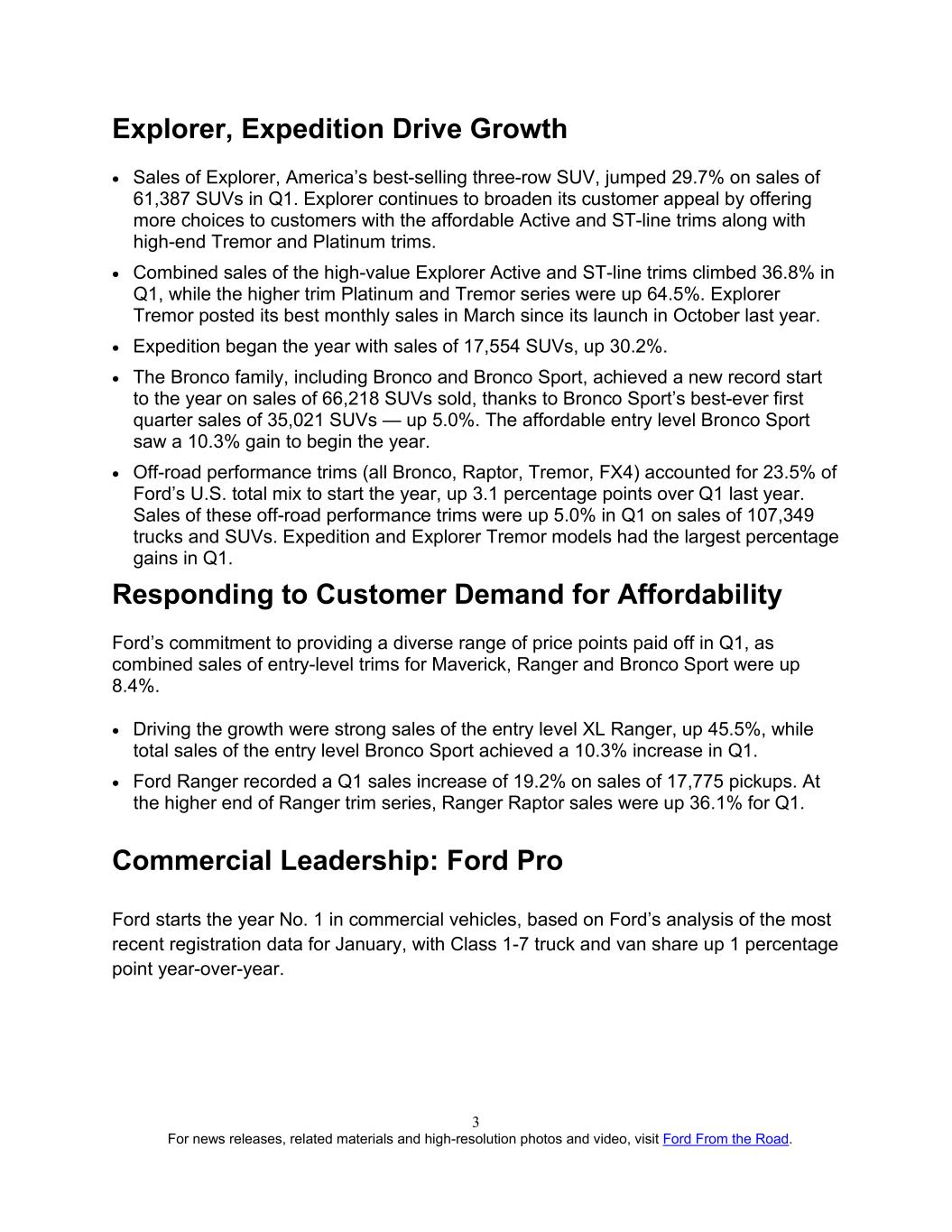 For news releases, related materials and high-resolution photos and video, visit Ford From the Road. 3 Explorer, Expedition Drive Growth • Sales of Explorer, America’s best-selling three-row SUV, jumped 29.7% on sales of 61,387 SUVs in Q1. Explorer continues to broaden its customer appeal by offering more choices to customers with the affordable Active and ST-line trims along with high-end Tremor and Platinum trims. • Combined sales of the high-value Explorer Active and ST-line trims climbed 36.8% in Q1, while the higher trim Platinum and Tremor series were up 64.5%. Explorer Tremor posted its best monthly sales in March since its launch in October last year. • Expedition began the year with sales of 17,554 SUVs, up 30.2%. • The Bronco family, including Bronco and Bronco Sport, achieved a new record start to the year on sales of 66,218 SUVs sold, thanks to Bronco Sport’s best-ever first quarter sales of 35,021 SUVs — up 5.0%. The affordable entry level Bronco Sport saw a 10.3% gain to begin the year. • Off-road performance trims (all Bronco, Raptor, Tremor, FX4) accounted for 23.5% of Ford’s U.S. total mix to start the year, up 3.1 percentage points over Q1 last year. Sales of these off-road performance trims were up 5.0% in Q1 on sales of 107,349 trucks and SUVs. Expedition and Explorer Tremor models had the largest percentage gains in Q1. Responding to Customer Demand for Affordability Ford’s commitment to providing a diverse range of price points paid off in Q1, as combined sales of entry-level trims for Maverick, Ranger and Bronco Sport were up 8.4%. • Driving the growth were strong sales of the entry level XL Ranger, up 45.5%, while total sales of the entry level Bronco Sport achieved a 10.3% increase in Q1. • Ford Ranger recorded a Q1 sales increase of 19.2% on sales of 17,775 pickups. At the higher end of Ranger trim series, Ranger Raptor sales were up 36.1% for Q1. Commercial Leadership: Ford Pro Ford starts the year No. 1 in commercial vehicles, based on Ford’s analysis of the most recent registration data for January, with Class 1-7 truck and van share up 1 percentage point year-over-year.