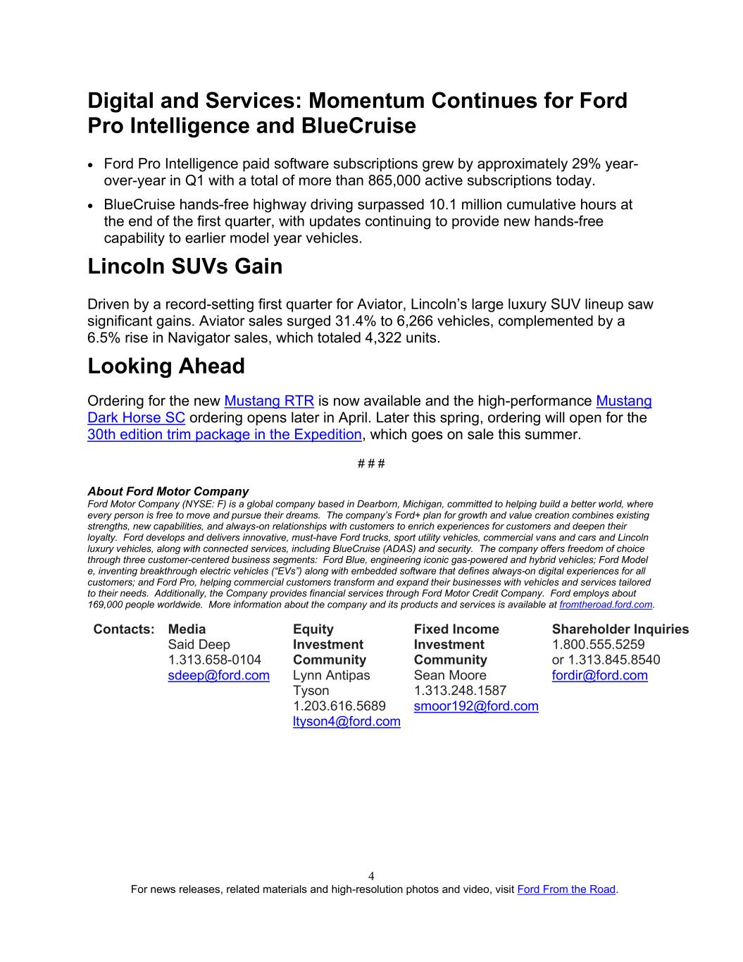 For news releases, related materials and high-resolution photos and video, visit Ford From the Road. 4 Digital and Services: Momentum Continues for Ford Pro Intelligence and BlueCruise • Ford Pro Intelligence paid software subscriptions grew by approximately 29% year- over-year in Q1 with a total of more than 865,000 active subscriptions today. • BlueCruise hands-free highway driving surpassed 10.1 million cumulative hours at the end of the first quarter, with updates continuing to provide new hands-free capability to earlier model year vehicles. Lincoln SUVs Gain Driven by a record-setting first quarter for Aviator, Lincoln’s large luxury SUV lineup saw significant gains. Aviator sales surged 31.4% to 6,266 vehicles, complemented by a 6.5% rise in Navigator sales, which totaled 4,322 units. Looking Ahead Ordering for the new Mustang RTR is now available and the high-performance Mustang Dark Horse SC ordering opens later in April. Later this spring, ordering will open for the 30th edition trim package in the Expedition, which goes on sale this summer. # # # About Ford Motor Company Ford Motor Company (NYSE: F) is a global company based in Dearborn, Michigan, committed to helping build a better world, where every person is free to move and pursue their dreams. The company’s Ford+ plan for growth and value creation combines existing strengths, new capabilities, and always-on relationships with customers to enrich experiences for customers and deepen their loyalty. Ford develops and delivers innovative, must-have Ford trucks, sport utility vehicles, commercial vans and cars and Lincoln luxury vehicles, along with connected services, including BlueCruise (ADAS) and security. The company offers freedom of choice through three customer-centered business segments: Ford Blue, engineering iconic gas-powered and hybrid vehicles; Ford Model e, inventing breakthrough electric vehicles (“EVs”) along with embedded software that defines always-on digital experiences for all customers; and Ford Pro, helping commercial customers transform and expand their businesses with vehicles and services tailored to their needs. Additionally, the Company provides financial services through Ford Motor Credit Company. Ford employs about 169,000 people worldwide. More information about the company and its products and services is available at fromtheroad.ford.com. Contacts: Media Said Deep 1.313.658-0104 sdeep@ford.com Equity Investment Community Lynn Antipas Tyson 1.203.616.5689 ltyson4@ford.com Fixed Income Investment Community Sean Moore 1.313.248.1587 smoor192@ford.com Shareholder Inquiries 1.800.555.5259 or 1.313.845.8540 fordir@ford.com