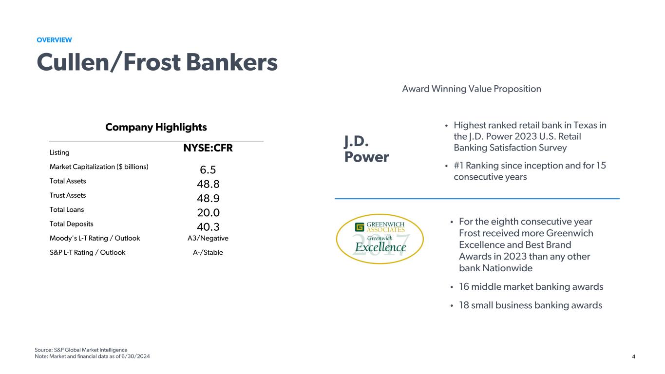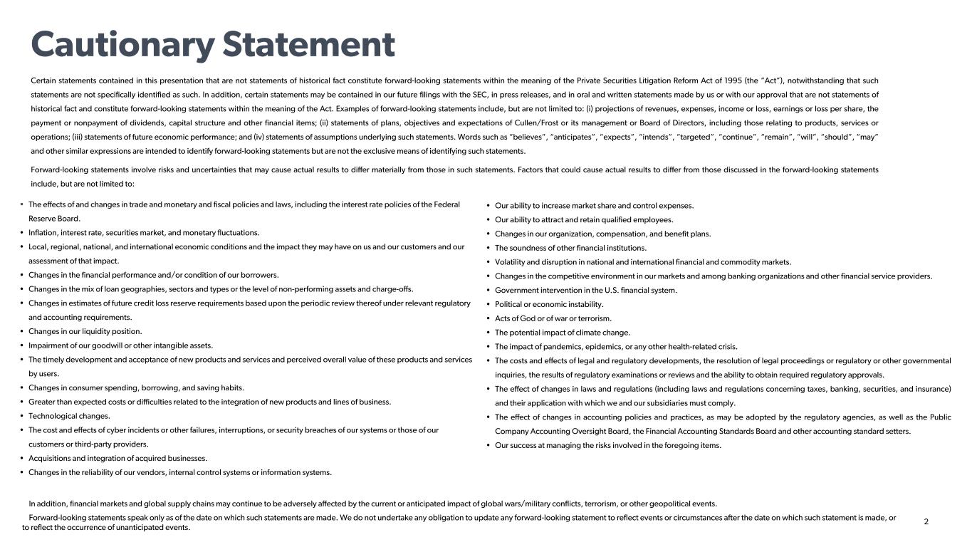 2 Cautionary Statement Certain statements contained in this presentation that are not statements of historical fact constitute forward-looking statements within the meaning of the Private Securities Litigation Reform Act of 1995 (the “Act”), notwithstanding that such statements are not specifically identified as such. In addition, certain statements may be contained in our future filings with the SEC, in press releases, and in oral and written statements made by us or with our approval that are not statements of historical fact and constitute forward-looking statements within the meaning of the Act. Examples of forward-looking statements include, but are not limited to: (i) projections of revenues, expenses, income or loss, earnings or loss per share, the payment or nonpayment of dividends, capital structure and other financial items; (ii)  statements of plans, objectives and expectations of Cullen/Frost or its management or Board of Directors, including those relating to products, services or operations; (iii) statements of future economic performance; and (iv) statements of assumptions underlying such statements. Words such as “believes”, “anticipates”, “expects”, “intends”, “targeted”, “continue”, “remain”, “will”, “should”, “may” and other similar expressions are intended to identify forward-looking statements but are not the exclusive means of identifying such statements. Forward-looking statements involve risks and uncertainties that may cause actual results to differ materially from those in such statements. Factors that could cause actual results to differ from those discussed in the forward-looking statements include, but are not limited to: In addition, financial markets and global supply chains may continue to be adversely affected by the current or anticipated impact of global wars/military conflicts, terrorism, or other geopolitical events. Forward-looking statements speak only as of the date on which such statements are made. We do not undertake any obligation to update any forward-looking statement to reflect events or circumstances after the date on which such statement is made, or to reflect the occurrence of unanticipated events. • Our ability to increase market share and control expenses. • Our ability to attract and retain qualified employees. • Changes in our organization, compensation, and benefit plans. • The soundness of other financial institutions. • Volatility and disruption in national and international financial and commodity markets. • Changes in the competitive environment in our markets and among banking organizations and other financial service providers. • Government intervention in the U.S. financial system. • Political or economic instability. • Acts of God or of war or terrorism. • The potential impact of climate change. • The impact of pandemics, epidemics, or any other health-related crisis. • The costs and effects of legal and regulatory developments, the resolution of legal proceedings or regulatory or other governmental inquiries, the results of regulatory examinations or reviews and the ability to obtain required regulatory approvals. • The effect of changes in laws and regulations (including laws and regulations concerning taxes, banking, securities, and insurance) and their application with which we and our subsidiaries must comply. • The effect of changes in accounting policies and practices, as may be adopted by the regulatory agencies, as well as the Public Company Accounting Oversight Board, the Financial Accounting Standards Board and other accounting standard setters. • Our success at managing the risks involved in the foregoing items. • The effects of and changes in trade and monetary and fiscal policies and laws, including the interest rate policies of the Federal Reserve Board. • Inflation, interest rate, securities market, and monetary fluctuations. • Local, regional, national, and international economic conditions and the impact they may have on us and our customers and our assessment of that impact. • Changes in the financial performance and/or condition of our borrowers. • Changes in the mix of loan geographies, sectors and types or the level of non-performing assets and charge-offs. • Changes in estimates of future credit loss reserve requirements based upon the periodic review thereof under relevant regulatory and accounting requirements. • Changes in our liquidity position. • Impairment of our goodwill or other intangible assets. • The timely development and acceptance of new products and services and perceived overall value of these products and services by users. • Changes in consumer spending, borrowing, and saving habits. • Greater than expected costs or difficulties related to the integration of new products and lines of business. • Technological changes. • The cost and effects of cyber incidents or other failures, interruptions, or security breaches of our systems or those of our customers or third-party providers. • Acquisitions and integration of acquired businesses. • Changes in the reliability of our vendors, internal control systems or information systems.