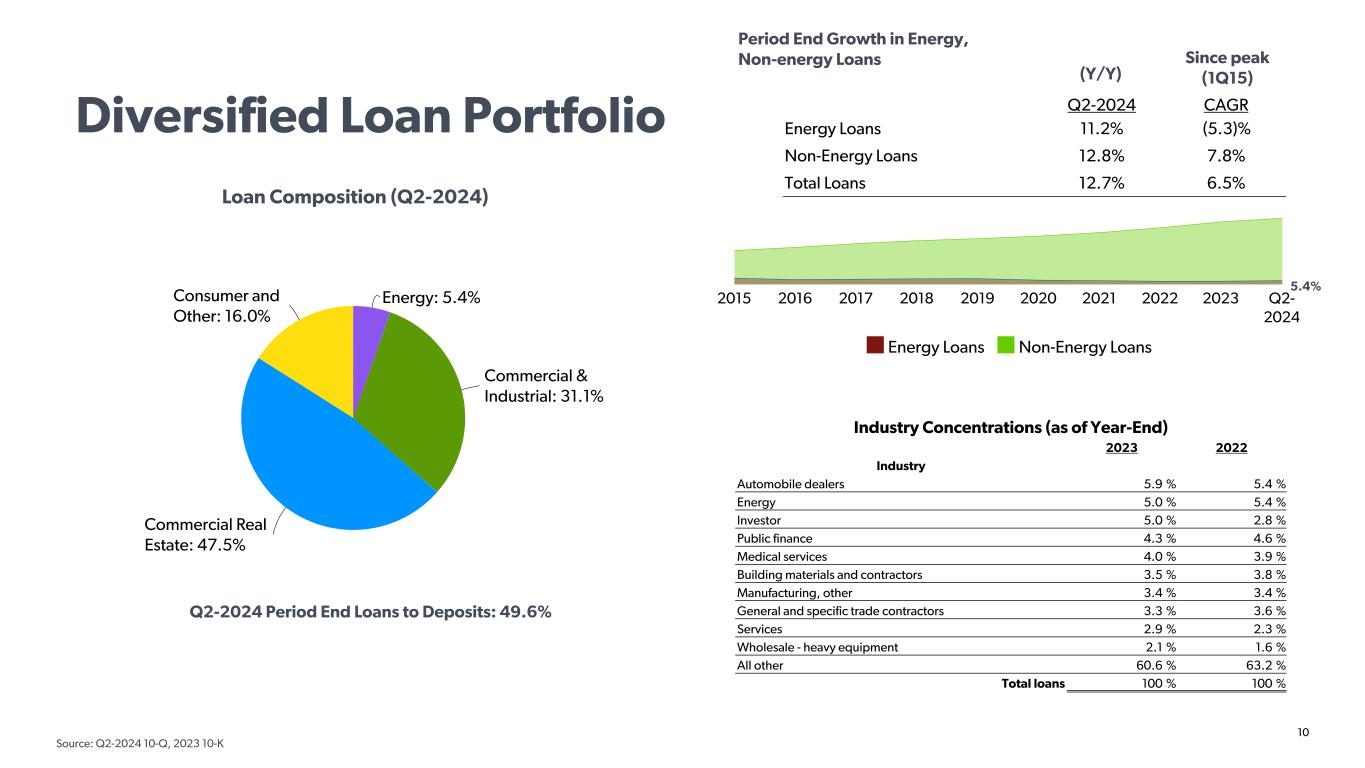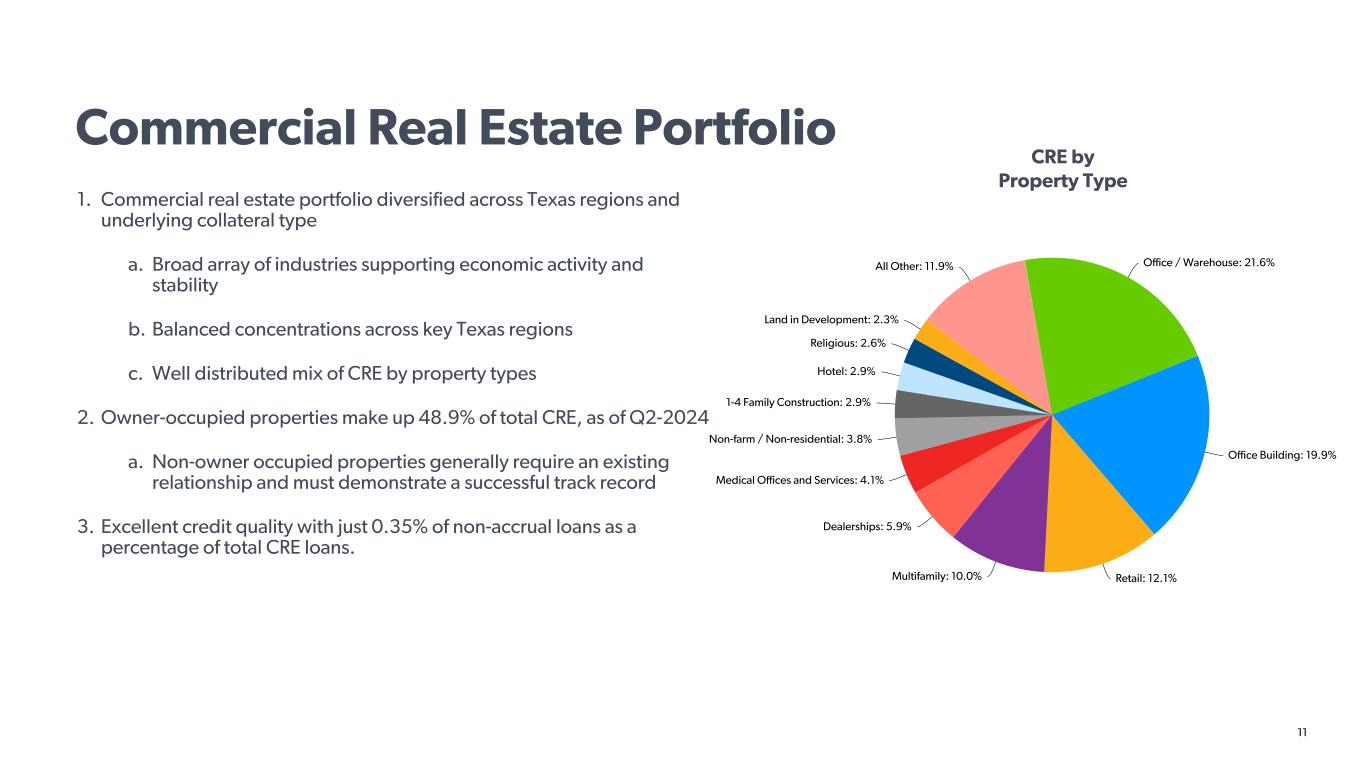 10 Diversified Loan Portfolio Period End Growth in Energy, Non-energy Loans Loan Composition (Q2-2024) Q2-2024 Period End Loans to Deposits: 49.6% Source: Q2-2024 10-Q, 2023 10-K Since peak (1Q15)(Y/Y)   Q2-2024 CAGR Energy Loans 11.2% (5.3)% Non-Energy Loans 12.8% 7.8% Total Loans 12.7% 6.5% 5.4% Energy Loans Non-Energy Loans 2015 2016 2017 2018 2019 2020 2021 2022 2023 Q2- 2024 Energy: 5.4% Commercial & Industrial: 31.1% Commercial Real Estate: 47.5% Consumer and Other: 16.0% Industry Concentrations (as of Year-End) 2023 2022 Industry Automobile dealers 5.9 % 5.4 % Energy 5.0 % 5.4 % Investor 5.0 % 2.8 % Public finance 4.3 % 4.6 % Medical services 4.0 % 3.9 % Building materials and contractors 3.5 % 3.8 % Manufacturing, other 3.4 % 3.4 % General and specific trade contractors 3.3 % 3.6 % Services 2.9 % 2.3 % Wholesale - heavy equipment 2.1 % 1.6 % All other 60.6 % 63.2 % Total loans 100 % 100 %
