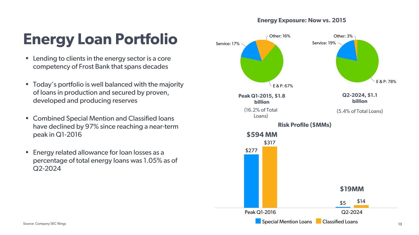 13 $277 $5 $317 $14 Special Mention Loans Classified Loans Peak Q1-2016 Q2-2024 Energy Loan Portfolio • Lending to clients in the energy sector is a core competency of Frost Bank that spans decades • Today’s portfolio is well balanced with the majority of loans in production and secured by proven, developed and producing reserves • Combined Special Mention and Classified loans have declined by 97% since reaching a near-term peak in Q1-2016 • Energy related allowance for loan losses as a percentage of total energy loans was 1.05% as of Q2-2024 Energy Exposure: Now vs. 2015 Peak Q1-2015, $1.8 billion Q2-2024, $1.1 billion (5.4% of Total Loans)(16.2% of Total Loans) $594 MM E & P: 67% Service: 17% Other: 16% E & P: 78% Service: 19% Other: 3% Risk Profile ($MMs) $19MM Source: Company SEC filings