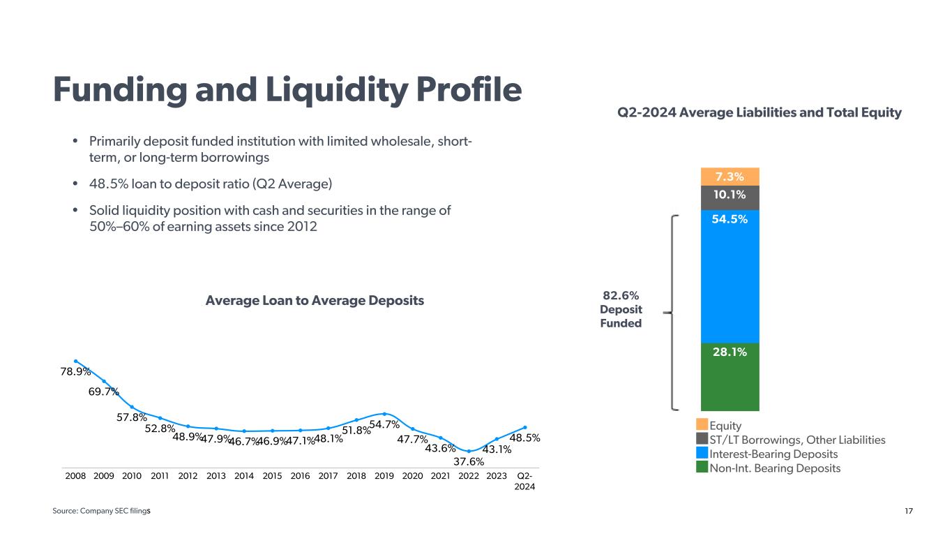17 Funding and Liquidity Profile • Primarily deposit funded institution with limited wholesale, short- term, or long-term borrowings • 48.5% loan to deposit ratio (Q2 Average) • Solid liquidity position with cash and securities in the range of 50%–60% of earning assets since 2012 Q2-2024 Average Liabilities and Total Equity Average Loan to Average Deposits 82.6% Deposit Funded • 1 Ratio of cash and cash equivalents and securities to total earning assets for 2018 was 55% 78.9% 69.7% 57.8% 52.8% 48.9%47.9%46.7%46.9%47.1%48.1% 51.8%54.7% 47.7% 43.6% 37.6% 43.1% 48.5% 2008 2009 2010 2011 2012 2013 2014 2015 2016 2017 2018 2019 2020 2021 2022 2023 Q2- 2024 28.1% 54.5% 10.1% 7.3% Equity ST/LT Borrowings, Other Liabilities Interest-Bearing Deposits Non-Int. Bearing Deposits Source: Company SEC filings