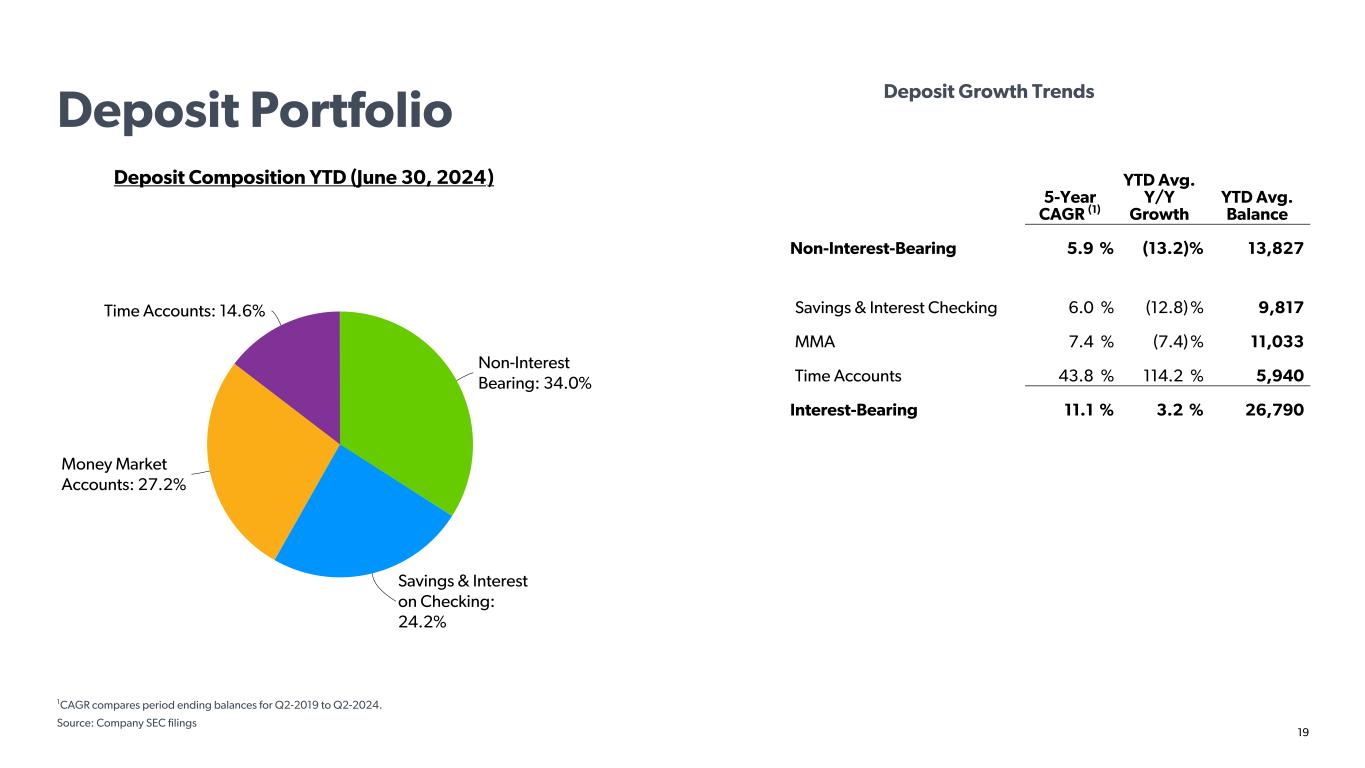 18 Deposit Portfolio • Highly focused on winning customers’ core transactional accounts • Non-interest-bearing averaged 39% of total deposits over the 20 years to 2023 • Goal to drive consistent, balanced growth in deposits and loans • Top quality customer service results in low customer attrition 1 YTD average balances 2 Regional banks defined by membership of the KBW Regional Bank Index as of June 30, 2024 . Peers included where data is available as of June 30, 2024 Source: Company SEC filings $ (B ill io ns ) Non-Interest-Bearing Savings & Interest Checking MMA Time Accounts 2020 2021 2022 2023 Q2-2024 0 5 10 15 20 25 30 35 40 45 50 Blended Cost of Deposits 0.1%0.08%0.05%0.04%0.03%0.07% 0.29%0.38% 0.10%0.04% 0.32% 1.46%1.56% 0.43% 0.31%0.27%0.26%0.27%0.33% 0.55% 0.78% 0.39% 0.14% 3 2.24%2.32% Peer Regional Banks Cullen/Frost 2012 2013 2014 2015 2016 2017 2018 2019 2020 2021 2022 2023 Q-2024 1 3 2 43.1% 26.3% 26.9% 24.2% 27.2% 34.0% 14.6% 3.7%