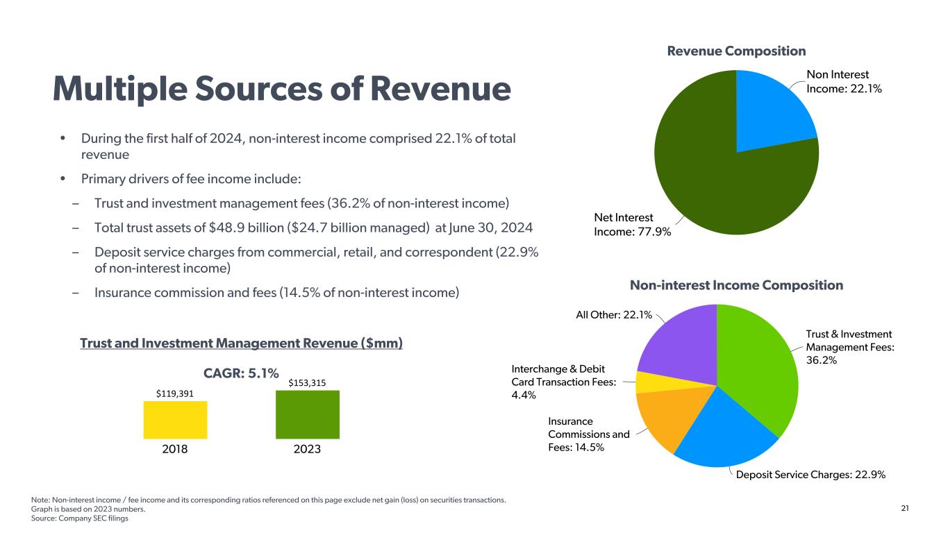 20 Investment Portfolio • High quality $18.8 billion securities portfolio comprised of municipals (37.8%), treasuries (20.7%), MBS and other securities1 (41.6%) 2 • Average fully taxable-equivalent yield of 3.38% in Q2-2024 (4.30% for tax-exempt securities) •Portfolio duration of 5.0 years 2 Municipal Bond Portfolio Highlights: • Municipal securities supported by strong credit ratings – 90% are AAA rated or pre-refunded • 100% of the portfolio issued by political subdivisions or agencies within Texas ◦ 72.9% of Texas issued municipal securities are either pre-refunded 2 or guaranteed by the Texas Permanent School Fund, which has a AAA insurer financial strength rating. Note: PSF denotes Permanent School Fund, which has a AAA rated insurer financial strength rating 1 Other securities include stock in the Federal Reserve Bank and the Federal Home Loan Bank 2 Date as of June 30, 2024 Investment Portfolio Q2-2024 Municipal Bond Portfolio Municipals: 37.8% Treasuries: 20.7% MBS and Other Securities: 41.6% Texas PSF or pre- refunded: 73% Texas Non- PSF: 27%