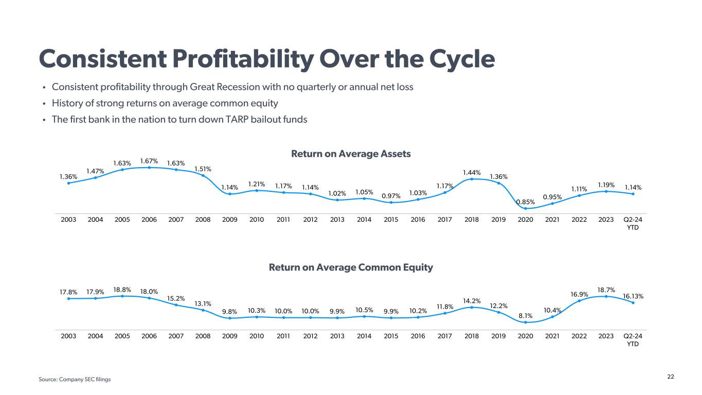 22 Consistent Profitability Over the Cycle • Consistent profitability through Great Recession with no quarterly or annual net loss • History of strong returns on average common equity • The first bank in the nation to turn down TARP bailout funds Return on Average Assets Return on Average Common Equity 1.36% 1.47% 1.63% 1.67% 1.63% 1.51% 1.14% 1.21% 1.17% 1.14% 1.02% 1.05% 0.97% 1.03% 1.17% 1.44% 1.36% 0.85% 0.95% 1.11% 1.19% 1.14% 2003 2004 2005 2006 2007 2008 2009 2010 2011 2012 2013 2014 2015 2016 2017 2018 2019 2020 2021 2022 2023 Q2-24 YTD 17.8% 17.9% 18.8% 18.0% 15.2% 13.1% 9.8% 10.3% 10.0% 10.0% 9.9% 10.5% 9.9% 10.2% 11.8% 14.2% 12.2% 8.1% 10.4% 16.9% 18.7% 16.13% 2003 2004 2005 2006 2007 2008 2009 2010 2011 2012 2013 2014 2015 2016 2017 2018 2019 2020 2021 2022 2023 Q2-24 YTD Source: Company SEC filings