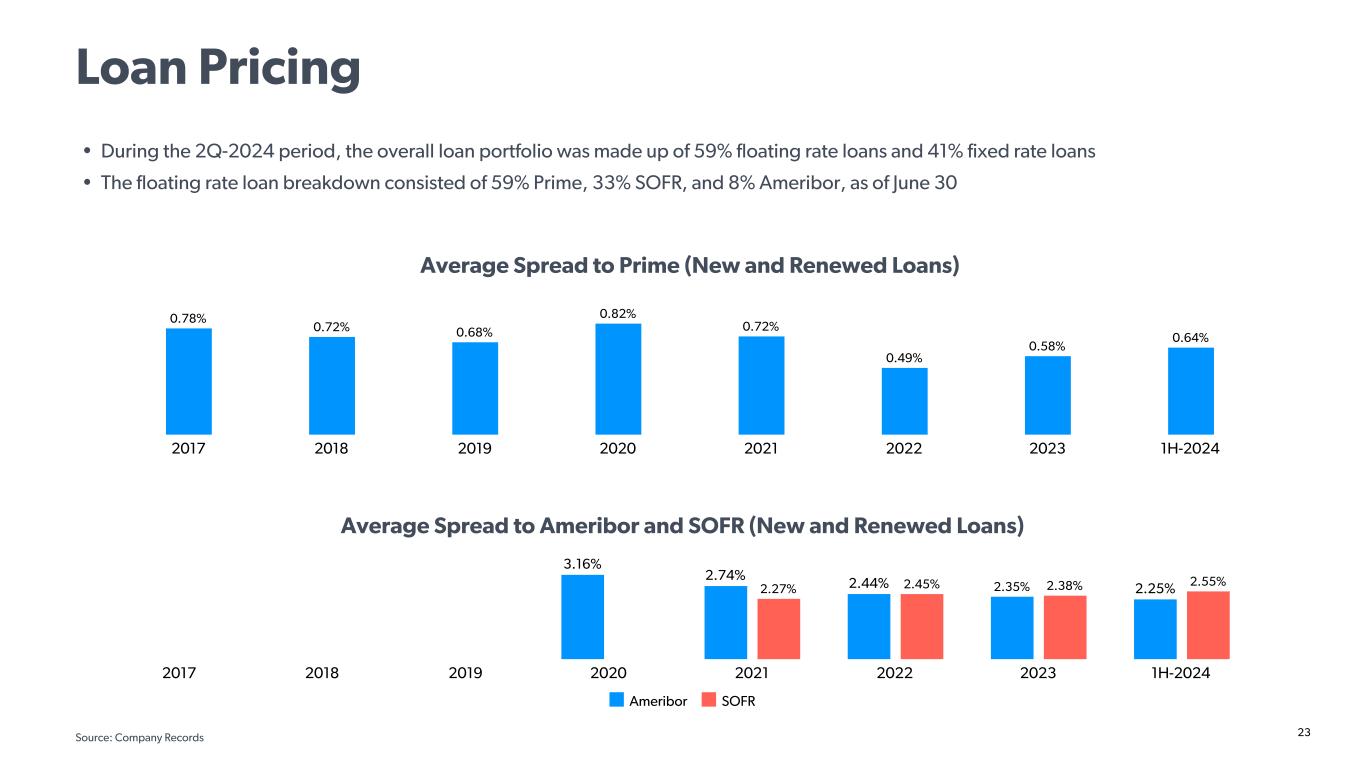 23 Loan Pricing Average Spread to Ameribor and SOFR (New and Renewed Loans) Average Spread to Prime (New and Renewed Loans) 3.16% 2.74% 2.44% 2.35% 2.25%2.27% 2.45% 2.38% 2.55% Ameribor SOFR 2017 2018 2019 2020 2021 2022 2023 1H-2024 0.78% 0.72% 0.68% 0.82% 0.72% 0.49% 0.58% 0.64% 2017 2018 2019 2020 2021 2022 2023 1H-2024 Source: Company Records • During the 2Q-2024 period, the overall loan portfolio was made up of 59% floating rate loans and 41% fixed rate loans • The floating rate loan breakdown consisted of 59% Prime, 33% SOFR, and 8% Ameribor, as of June 30