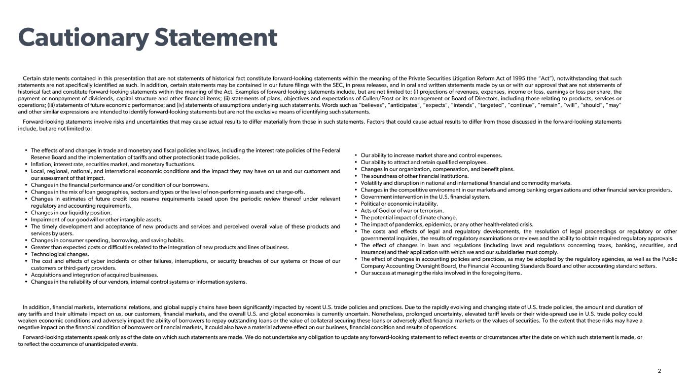 2 Cautionary Statement Certain statements contained in this presentation that are not statements of historical fact constitute forward-looking statements within the meaning of the Private Securities Litigation Reform Act of 1995 (the “Act”), notwithstanding that such statements are not specifically identified as such. In addition, certain statements may be contained in our future filings with the SEC, in press releases, and in oral and written statements made by us or with our approval that are not statements of historical fact and constitute forward-looking statements within the meaning of the Act. Examples of forward-looking statements include, but are not limited to: (i) projections of revenues, expenses, income or loss, earnings or loss per share, the payment or nonpayment of dividends, capital structure and other financial items; (ii)  statements of plans, objectives and expectations of Cullen/Frost or its management or Board of Directors, including those relating to products, services or operations; (iii) statements of future economic performance; and (iv) statements of assumptions underlying such statements. Words such as “believes”, “anticipates”, “expects”, “intends”, “targeted”, “continue”, “remain”, “will”, “should”, “may” and other similar expressions are intended to identify forward-looking statements but are not the exclusive means of identifying such statements. Forward-looking statements involve risks and uncertainties that may cause actual results to differ materially from those in such statements. Factors that could cause actual results to differ from those discussed in the forward-looking statements include, but are not limited to: In addition, financial markets, international relations, and global supply chains have been significantly impacted by recent U.S. trade policies and practices. Due to the rapidly evolving and changing state of U.S. trade policies, the amount and duration of any tariffs and their ultimate impact on us, our customers, financial markets, and the overall U.S. and global economies is currently uncertain. Nonetheless, prolonged uncertainty, elevated tariff levels or their wide-spread use in U.S. trade policy could weaken economic conditions and adversely impact the ability of borrowers to repay outstanding loans or the value of collateral securing these loans or adversely affect financial markets or the values of securities. To the extent that these risks may have a negative impact on the financial condition of borrowers or financial markets, it could also have a material adverse effect on our business, financial condition and results of operations. Forward-looking statements speak only as of the date on which such statements are made. We do not undertake any obligation to update any forward-looking statement to reflect events or circumstances after the date on which such statement is made, or to reflect the occurrence of unanticipated events. • Our ability to increase market share and control expenses. • Our ability to attract and retain qualified employees. • Changes in our organization, compensation, and benefit plans. • The soundness of other financial institutions. • Volatility and disruption in national and international financial and commodity markets. • Changes in the competitive environment in our markets and among banking organizations and other financial service providers. • Government intervention in the U.S. financial system. • Political or economic instability. • Acts of God or of war or terrorism. • The potential impact of climate change. • The impact of pandemics, epidemics, or any other health-related crisis. • The costs and effects of legal and regulatory developments, the resolution of legal proceedings or regulatory or other governmental inquiries, the results of regulatory examinations or reviews and the ability to obtain required regulatory approvals. • The effect of changes in laws and regulations (including laws and regulations concerning taxes, banking, securities, and insurance) and their application with which we and our subsidiaries must comply. • The effect of changes in accounting policies and practices, as may be adopted by the regulatory agencies, as well as the Public Company Accounting Oversight Board, the Financial Accounting Standards Board and other accounting standard setters. • Our success at managing the risks involved in the foregoing items. • The effects of and changes in trade and monetary and fiscal policies and laws, including the interest rate policies of the Federal Reserve Board and the implementation of tariffs and other protectionist trade policies. • Inflation, interest rate, securities market, and monetary fluctuations. • Local, regional, national, and international economic conditions and the impact they may have on us and our customers and our assessment of that impact. • Changes in the financial performance and/or condition of our borrowers. • Changes in the mix of loan geographies, sectors and types or the level of non-performing assets and charge-offs. • Changes in estimates of future credit loss reserve requirements based upon the periodic review thereof under relevant regulatory and accounting requirements. • Changes in our liquidity position. • Impairment of our goodwill or other intangible assets. • The timely development and acceptance of new products and services and perceived overall value of these products and services by users. • Changes in consumer spending, borrowing, and saving habits. • Greater than expected costs or difficulties related to the integration of new products and lines of business. • Technological changes. • The cost and effects of cyber incidents or other failures, interruptions, or security breaches of our systems or those of our customers or third-party providers. • Acquisitions and integration of acquired businesses. • Changes in the reliability of our ven