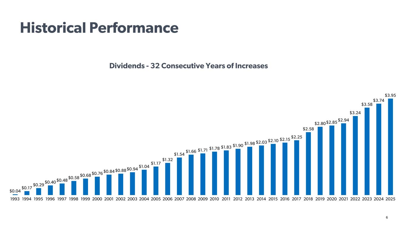 6 Dividends - 32 Consecutive Years of Increases $0.04 $0.17 $0.29 $0.40 $0.48 $0.58 $0.68 $0.76 $0.84 $0.88$0.94 $1.04 $1.17 $1.32 $1.54 $1.66 $1.71 $1.78 $1.83 $1.90 $1.98 $2.03 $2.10 $2.15 $2.25 $2.58 $2.80$2.85 $2.94 $3.24 $3.58 $3.74 $3.95 1993 1994 1995 1996 1997 1998 1999 2000 2001 2002 2003 2004 2005 2006 2007 2008 2009 2010 2011 2012 2013 2014 2015 2016 2017 2018 2019 2020 2021 2022 2023 2024 2025 Historical Performance