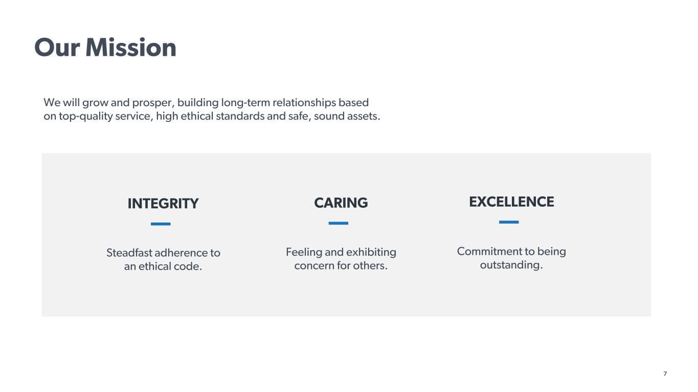 7 We will grow and prosper, building long-term relationships based on top-quality service, high ethical standards and safe, sound assets. INTEGRITY Steadfast adherence to an ethical code. CARING Feeling and exhibiting concern for others. EXCELLENCE Commitment to being outstanding. Our Mission