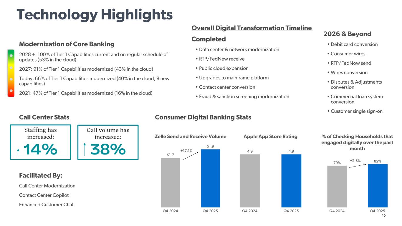 9 Technology Highlights • In Q4-2025, 53% of consumer deposit account openings came from our online channel • Highest-rated consumer banking mobile app of all U.S. banks • Delivered new features to enable a more personalized, secure, and goal- oriented digital banking experience • 24/7 customer phone and chat support with real humans • Consumer digital-channel money-movement increased 8% from Q4-2024 to Q4-2025