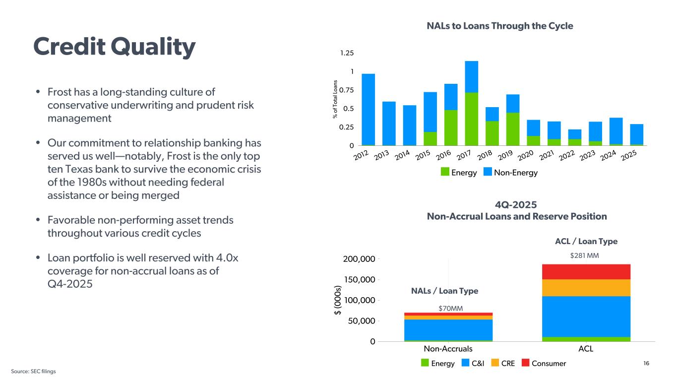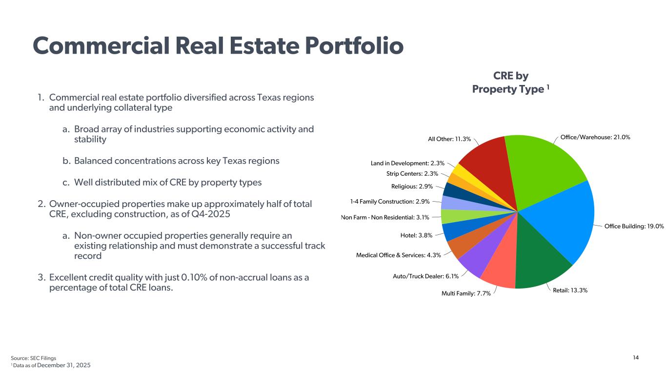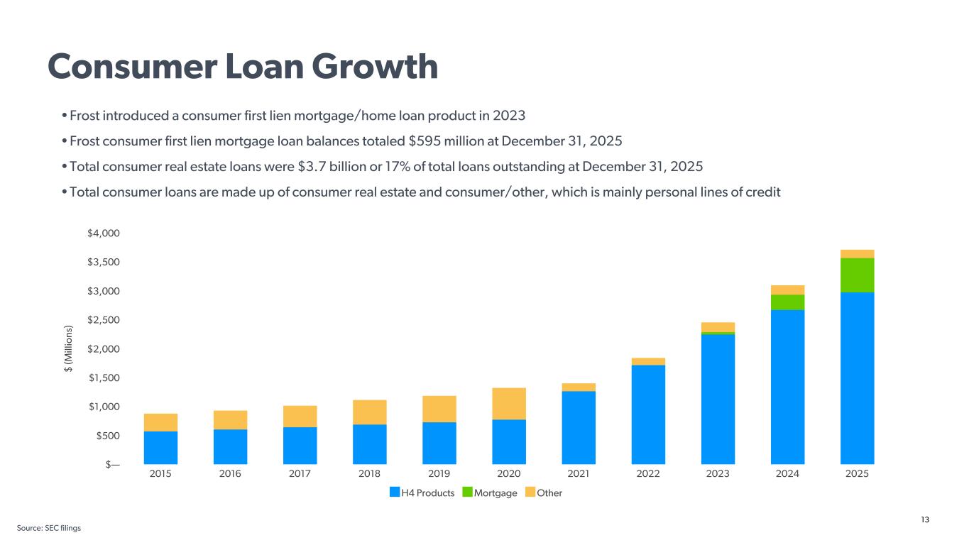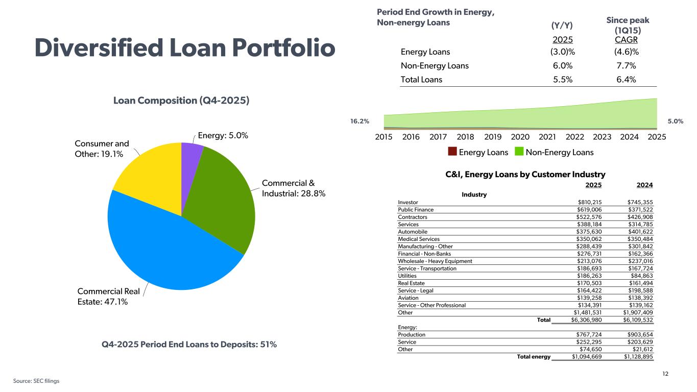 12 Period End Growth in Energy, Non-energy Loans Loan Composition (Q4-2025) Q4-2025 Period End Loans to Deposits: 51% Since peak (1Q15) (Y/Y)   2025 CAGR Energy Loans (3.0)% (4.6)% Non-Energy Loans 6.0% 7.7% Total Loans 5.5% 6.4% 5.0% Energy Loans Non-Energy Loans 2015 2016 2017 2018 2019 2020 2021 2022 2023 2024 2025Energy: 5.0% Commercial & Industrial: 28.8% Commercial Real Estate: 47.1% Consumer and Other: 19.1% C&I, Energy Loans by Customer Industry 2025 2024 Industry Investor $810,215 $745,355 Public Finance $619,006 $371,522 Contractors $522,576 $426,908 Services $388,184 $314,785 Automobile $375,630 $401,622 Medical Services $350,062 $350,484 Manufacturing - Other $288,439 $301,842 Financial - Non-Banks $276,731 $162,366 Wholesale - Heavy Equipment $213,076 $237,016 Service - Transportation $186,693 $167,724 Utilities $186,263 $84,863 Real Estate $170,503 $161,494 Service - Legal $164,422 $198,588 Aviation $139,258 $138,392 Service - Other Professional $134,391 $139,162 Other $1,481,531 $1,907,409 Total $6,306,980 $6,109,532 Energy: Production $767,724 $903,654 Service $252,295 $203,629 Other $74,650 $21,612 Total energy $1,094,669 $1,128,895 16.2% Diversified Loan Portfolio Source: SEC filings
