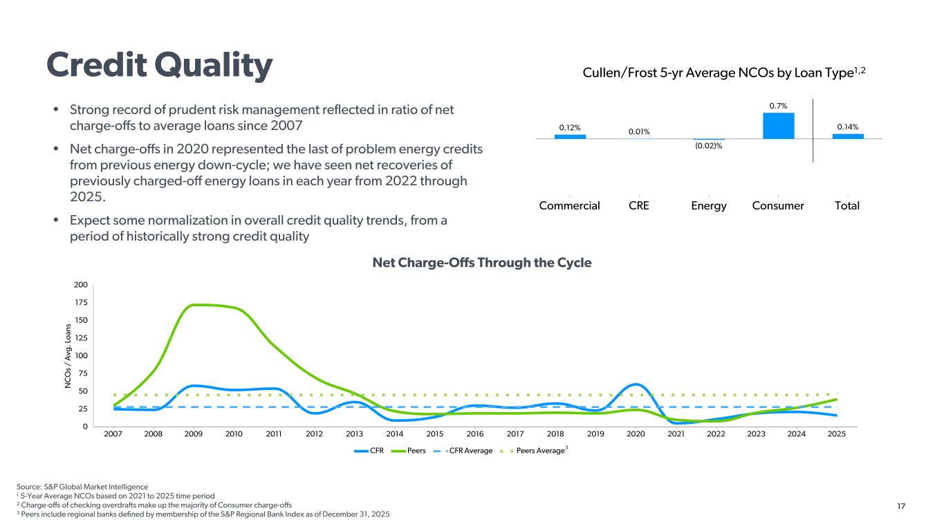 16 $ (0 00 s) Energy C&I CRE Consumer Non-Accruals ACL 0 50,000 100,000 150,000 200,000 • Frost has a long-standing culture of conservative underwriting and prudent risk management • Our commitment to relationship banking has served us well—notably, Frost is the only top ten Texas bank to survive the economic crisis of the 1980s without needing federal assistance or being merged • Favorable non-performing asset trends throughout various credit cycles • Loan portfolio is well reserved with 4.0x coverage for non-accrual loans as of Q4-2025 NALs to Loans Through the Cycle 4Q-2025 Non-Accrual Loans and Reserve Position ACL / Loan Type NALs / Loan Type $70MM $281 MM % o f T ot al L oa ns Energy Non-Energy 2012 2013 2014 2015 2016 2017 2018 2019 2020 2021 2022 2023 2024 2025 0 0.25 0.5 0.75 1 1.25 Source: SEC filings Credit Quality