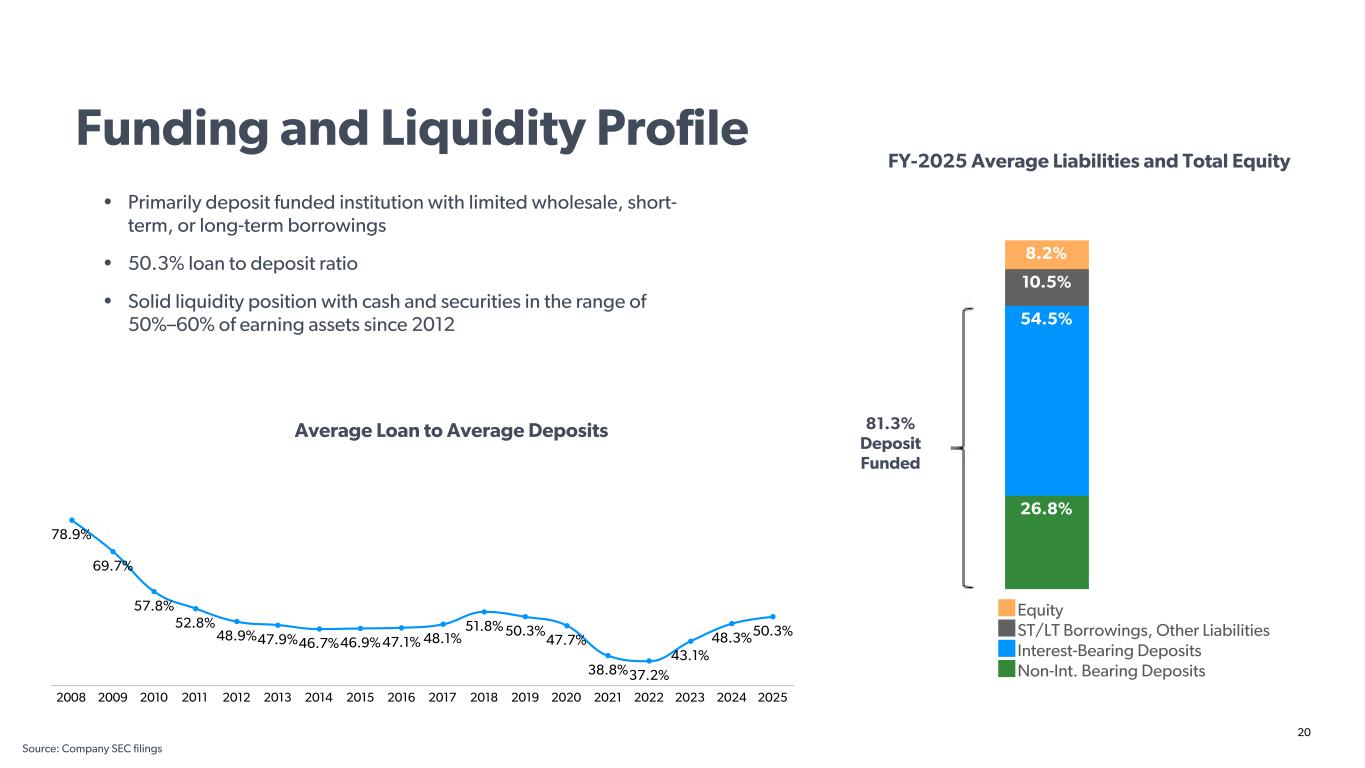 19 Deposit Composition (2025 Avg.) Deposit Growth Trends Non-Interest Bearing: 33.0% Savings & Interest on Checking: 23.4% Money Market Accounts: 28.1% Time Accounts: 15.6% 5-Year CAGR (1) 2025 Y/Y Avg. Growth 2025 Avg. Balance Non-Interest-Bearing 0.5 % 0.6 % 13,924 Savings & Interest Checking 4.9 % 1.8 % 9,869 MMA 7.2 % 5.6 % 11,850 Time Accounts 42.4 % 5.8 % 6,569 Interest-Bearing 9.6 % 4.3 % 28,287 1 CAGR compares average balances for Q4-2020 to Q4-2025 Deposit Portfolio