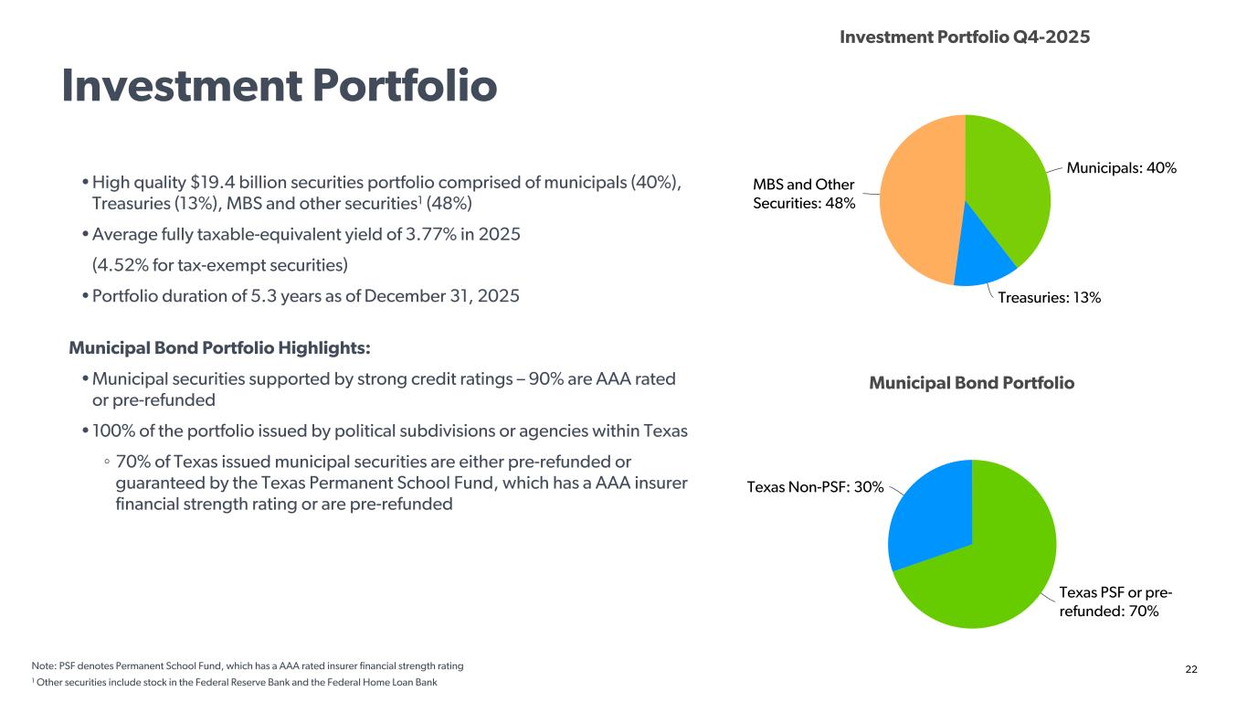 22 • High quality $19.4 billion securities portfolio comprised of municipals (40%), Treasuries (13%), MBS and other securities1 (48%) • Average fully taxable-equivalent yield of 3.77% in 2025 (4.52% for tax-exempt securities) • Portfolio duration of 5.3 years as of December 31, 2025 Municipal Bond Portfolio Highlights: • Municipal securities supported by strong credit ratings – 90% are AAA rated or pre-refunded • 100% of the portfolio issued by political subdivisions or agencies within Texas ◦ 70% of Texas issued municipal securities are either pre-refunded or guaranteed by the Texas Permanent School Fund, which has a AAA insurer financial strength rating or are pre-refunded Investment Portfolio Q4-2025 Municipals: 40% Treasuries: 13% MBS and Other Securities: 48% Municipal Bond Portfolio Texas PSF or pre- refunded: 70% Texas Non-PSF: 30% Investment Portfolio Note: PSF denotes Permanent School Fund, which has a AAA rated insurer financial strength rating 1 Other securities include stock in the Federal Reserve Bank and the Federal Home Loan Bank