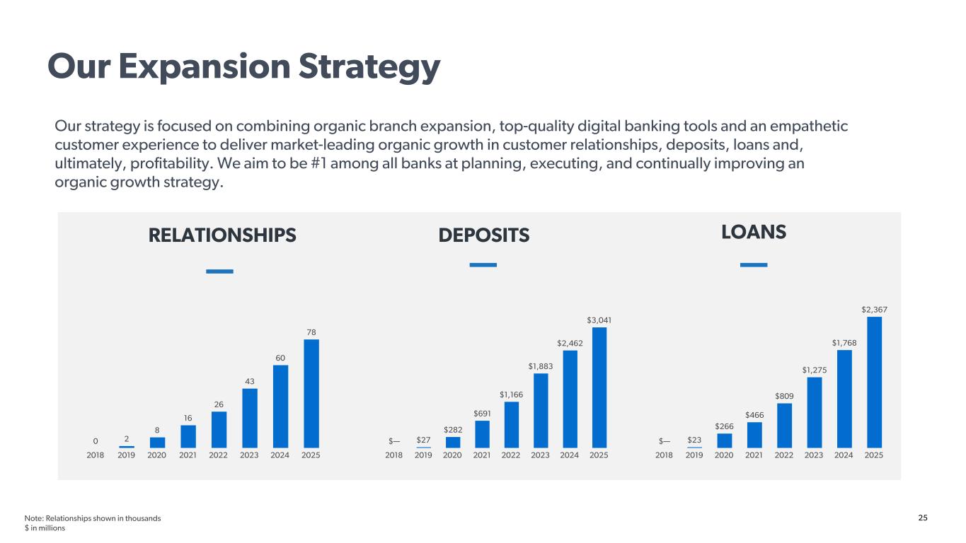 25 Our strategy is focused on combining organic branch expansion, top-quality digital banking tools and an empathetic customer experience to deliver market-leading organic growth in customer relationships, deposits, loans and, ultimately, profitability. We aim to be #1 among all banks at planning, executing, and continually improving an organic growth strategy. RELATIONSHIPS DEPOSITS LOANS $— $23 $266 $466 $809 $1,275 $1,768 $2,367 2018 2019 2020 2021 2022 2023 2024 2025 0 2 8 16 26 43 60 78 2018 2019 2020 2021 2022 2023 2024 2025 $— $27 $282 $691 $1,166 $1,883 $2,462 $3,041 2018 2019 2020 2021 2022 2023 2024 2025 Note: Relationships shown in thousands $ in millions Our Expansion Strategy