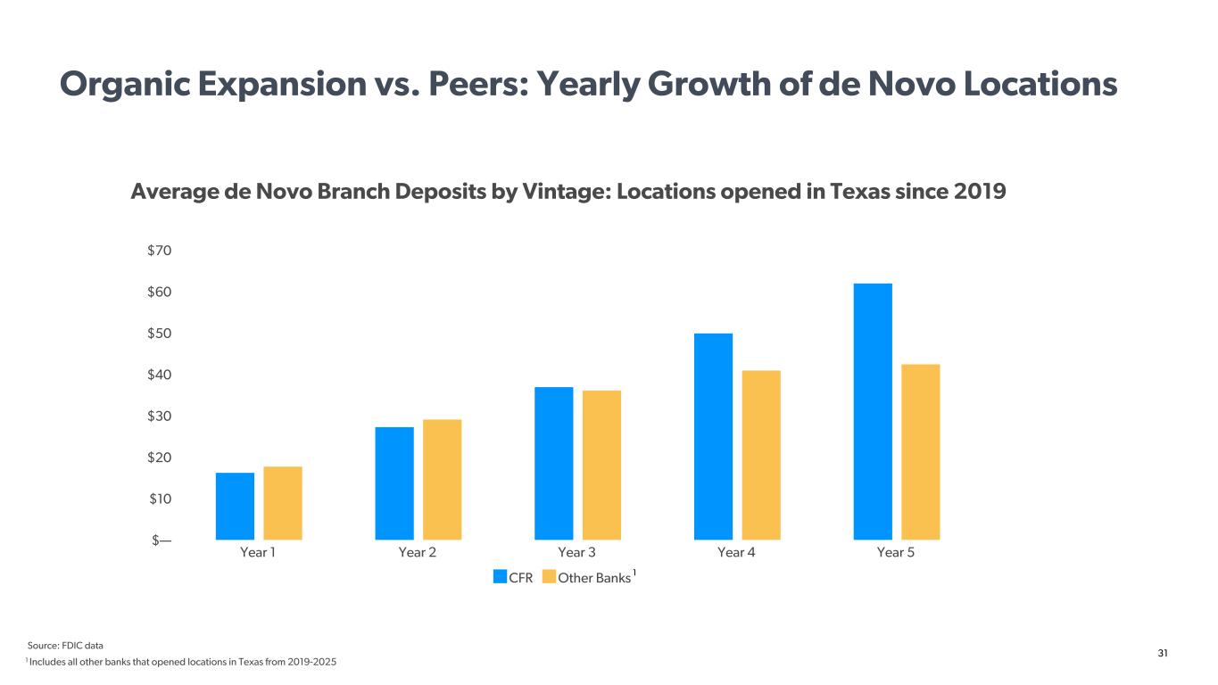30 Organic Strategy (Houston 1.0) Cullen/Frost WNB Acquisition (2014) Texas Bank M&A Average Loans $599 $656 $3,322 Deposits $1,179 $1,242 $4,377 Cost/Deal Value $119 $220 $802 Cost per $1B of Deposits $101 $180 $175 Notes: $ in millions, except EPS Texas Deals Average figures use median Organic EPS accretion est. 2027 Sources: Internal data, peers' M&A presentations including: Prosperity (ABHC), SouthState (IBTX), Prosperity (First Bancshares), Home Bancshares (Happy), Huntington (VBTX), Glacier (Guaranty), Veritex (GNBC), Prosperity (LTXB), PNC (BBVA), Simmons (SOTB) Organic Expansion vs. M&A: Cost Comparison