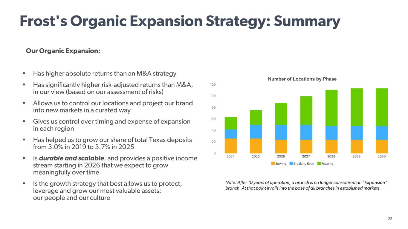 32 Source: Internal data Note: Of the markets displayed, Austin is the only market that is both part of the Expansion, and also an established market in terms of deposit share/branch share due to an FDIC-assisted acquisition in this market in the 1990s. Organic Expansion: Long-Term Opportunity San Antonio Fort Worth Austin Houston Dallas 2025 Deposit Share to Branch Share 2.7x 1.7x 1.2x 0.5x 0.3x 2019 2025 Branch Share: 6.0% Deposit Share: 7.3% Branch Share: 9.9% Deposit Share: 27.1% Branch Share: 1.4% Deposit Share: 0.9% Branch Share: 2.6% Deposit Share: 1.8% Branch Share: 9.3% Deposit Share: 19.5% Branch Share: 4.3% Deposit Share: 7.9% • In more mature markets like San Antonio and Austin, deposit market share is significantly greater than branch share. • In Expansion markets (Houston and Dallas), our share of branches has expanded significantly • New locations typically grow deposits at a greater-than-company average rate for 10 years after opening • Over time, we expect our deposit market share (relative to branch share) in Expansion markets to look more like established markets Branch Share: 5.4% Deposit Share: 11.2% Branch Share: 6.2% Deposit Share: 10.7% Branch Share: 3.9% Deposit Share: 1.1% Branch Share: 4.9% Deposit Share: 2.3%