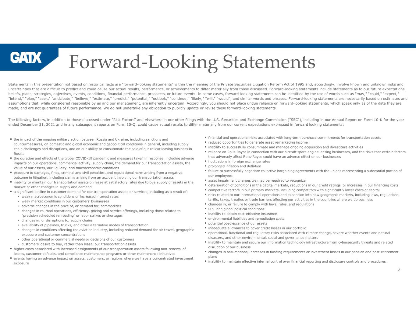 Statements in this presentation not based on historical facts are "forward-looking statements" within the meaning of the Private Securities Litigation Reform Act of 1995 and, accordingly, involve known and unknown risks and uncertainties that are difficult to predict and could cause our actual results, performance, or achievements to differ materially from those discussed. Forward-looking statements include statements as to our future expectations, beliefs, plans, strategies, objectives, events, conditions, financial performance, prospects, or future events. In some cases, forward-looking statements can be identified by the use of words such as "may," "could," "expect," "intend," "plan," "seek," "anticipate," "believe," "estimate," "predict," "potential," "outlook," "continue," "likely," "will," "would", and similar words and phrases. Forward-looking statements are necessarily based on estimates and assumptions that, while considered reasonable by us and our management, are inherently uncertain. Accordingly, you should not place undue reliance on forward-looking statements, which speak only as of the date they are made, and are not guarantees of future performance. We do not undertake any obligation to publicly update or revise these forward-looking statements. ecurities and Exchange Commission ("SEC"), including in our Annual Report on Form 10-K for the year ended December 31, 2021 and in any subsequent reports on Form 10-Q, could cause actual results to differ materially from our current expectations expressed in forward looking statements: the impact of the ongoing military action between Russia and Ukraine, including sanctions and countermeasures, on domestic and global economic and geopolitical conditions in general, including supply chain challenges and disruptions, and on our ability to consummate the sale of our railcar leasing business in Russia the duration and effects of the global COVID-19 pandemic and measures taken in response, including adverse impacts on our operations, commercial activity, supply chain, the demand for our transportation assets, the value of our assets, our liquidity, and macroeconomic conditions exposure to damages, fines, criminal and civil penalties, and reputational harm arising from a negative outcome in litigation, including claims arising from an accident involving our transportation assets inability to maintain our transportation assets on lease at satisfactory rates due to oversupply of assets in the market or other changes in supply and demand a significant decline in customer demand for our transportation assets or services, including as a result of: weak macroeconomic conditions or increased interest rates weak market conditions in our customers' businesses adverse changes in the price of, or demand for, commodities changes in railroad operations, efficiency, pricing and service offerings, including those related to "precision scheduled railroading" or labor strikes or shortages changes in, or disruptions to, supply chains availability of pipelines, trucks, and other alternative modes of transportation changes in conditions affecting the aviation industry, including reduced demand for air travel, geographic exposure and customer concentrations other operational or commercial needs or decisions of our customers customers' desire to buy, rather than lease, our transportation assets higher costs associated with increased assignments of our transportation assets following non-renewal of leases, customer defaults, and compliance maintenance programs or other maintenance initiatives events having an adverse impact on assets, customers, or regions where we have a concentrated investment exposure financial and operational risks associated with long-term purchase commitments for transportation assets reduced opportunities to generate asset remarketing income inability to successfully consummate and manage ongoing acquisition and divestiture activities reliance on Rolls-Royce in connection with our aircraft spare engine leasing businesses, and the risks that certain factors that adversely affect Rolls-Royce could have an adverse effect on our businesses fluctuations in foreign exchange rates prolonged inflation and deflation failure to successfully negotiate collective bargaining agreements with the unions representing a substantial portion of our employees asset impairment charges we may be required to recognize deterioration of conditions in the capital markets, reductions in our credit ratings, or increases in our financing costs competitive factors in our primary markets, including competitors with significantly lower costs of capital risks related to our international operations and expansion into new geographic markets, including laws, regulations, tariffs, taxes, treaties or trade barriers affecting our activities in the countries where we do business changes in, or failure to comply with laws, rules, and regulations U.S. and global political conditions inability to obtain cost-effective insurance environmental liabilities and remediation costs potential obsolescence of our assets inadequate allowances to cover credit losses in our portfolio operational, functional and regulatory risks associated with climate change, severe weather events and natural disasters, and other environmental, social and governance matters inability to maintain and secure our information technology infrastructure from cybersecurity threats and related disruption of our business changes in assumptions, increases in funding requirements or investment losses in our pension and post-retirement plans inability to maintain effective internal control over financial reporting and disclosure controls and procedures 2 Forward-Looking Statements