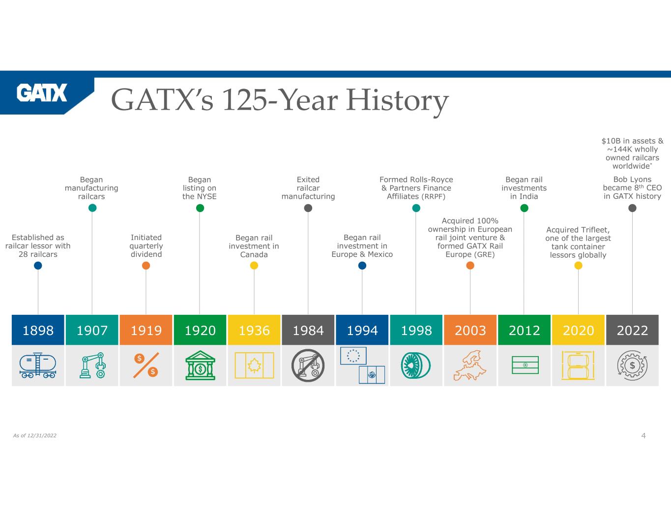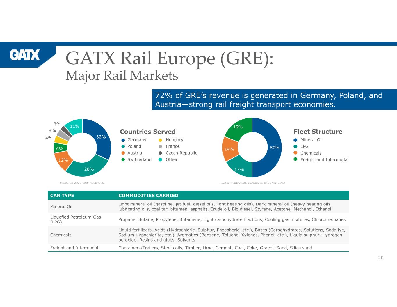 97% 95% 97% 99% 99% 90% 92% 94% 96% 98% 100% 2006 2008 2010 2012 2014 2016 2018 2020 2022 41% 14% 11% 34% GATX Rail International Overview 2 0 2 2 OVERVIEW Fleet Count Car Type Count Average Fleet Age (GRE) Number of Customers Primary Countries of Operation 28,000+ in Europe (GRE) 5,800+ in India 50+ 17 years 260+ Germany, Poland, Austria, India, Switzerland, Hungary, France, Czech Republic, The Netherlands Based on 2022 Rail International Fleet Count Industries Served GRE Fleet Utilization 19 Mineral Oil Liquefied Petroleum Gas Chemicals Freight & Intermodal