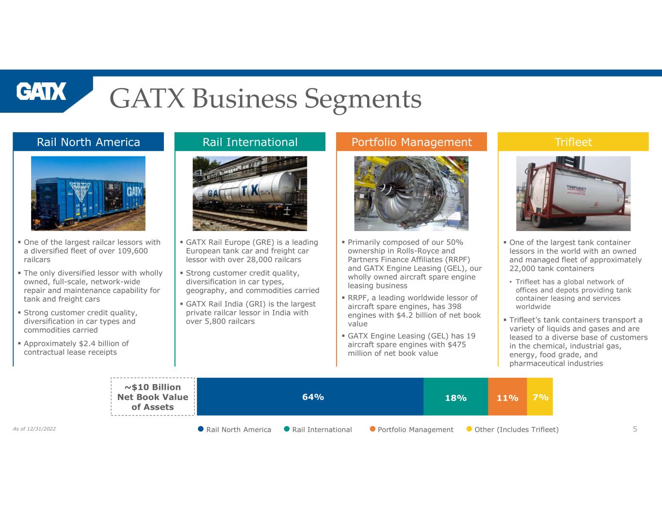 Established as railcar lessor with 28 railcars -Year History 4 1898 1907 1919 1920 1936 1984 1994 1998 2003 2012 2020 2022 Began manufacturing railcars Initiated quarterly dividend Began listing on the NYSE Began rail investment in Canada Exited railcar manufacturing Began rail investment in Europe & Mexico Formed Rolls-Royce & Partners Finance Affiliates (RRPF) Acquired 100% ownership in European rail joint venture & formed GATX Rail Europe (GRE) Began rail investments in India Acquired Trifleet, one of the largest tank container lessors globally $10B in assets & ~144K wholly owned railcars worldwide* Bob Lyons became 8th CEO in GATX history As of 12/31/2022