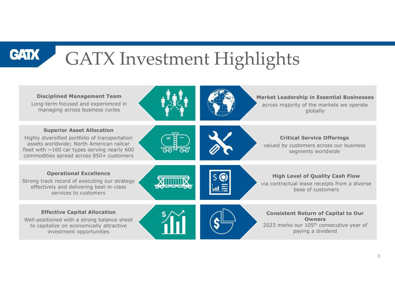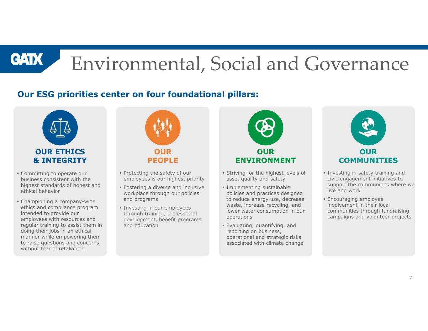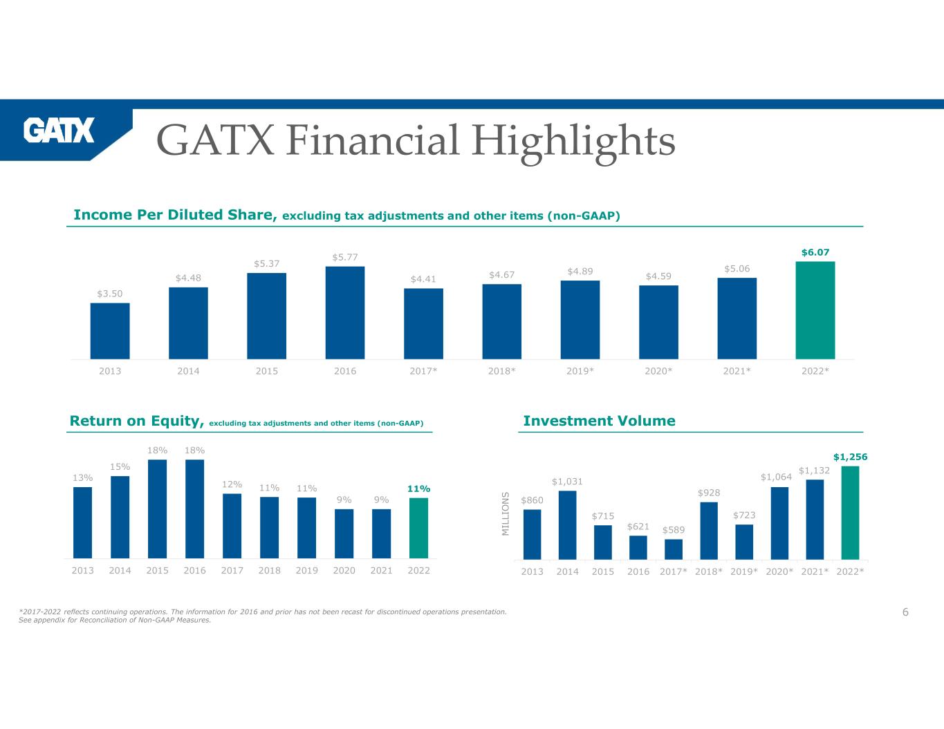*2017-2022 reflects continuing operations. The information for 2016 and prior has not been recast for discontinued operations presentation. See appendix for Reconciliation of Non-GAAP Measures. GATX Financial Highlights $3.50 $4.48 $5.37 $5.77 $4.41 $4.67 $4.89 $4.59 $5.06 $6.07 2013 2014 2015 2016 2017* 2018* 2019* 2020* 2021* 2022* 13% 15% 18% 18% 12% 11% 11% 9% 9% 11% 2013 2014 2015 2016 2017 2018 2019 2020 2021 2022 $860 $1,031 $715 $621 $589 $928 $723 $1,064 $1,132 $1,256 2013 2014 2015 2016 2017* 2018* 2019* 2020* 2021* 2022* Income Per Diluted Share, excluding tax adjustments and other items (non-GAAP) Return on Equity, excluding tax adjustments and other items (non-GAAP) Investment Volume 6