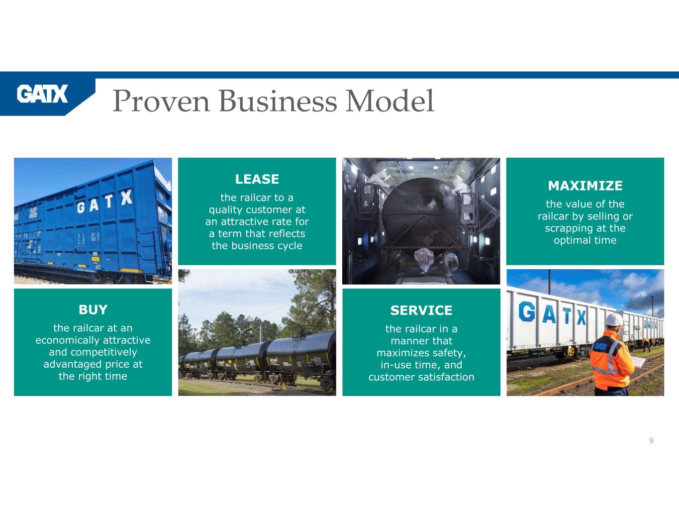 GATX Investment Highlights 8 Operational Excellence Strong track record of executing our strategy effectively and delivering best-in-class services to customers Critical Service Offerings valued by customers across our business segments worldwide Market Leadership in Essential Businesses across majority of the markets we operate globally Disciplined Management Team Long-term focused and experienced in managing across business cycles High Level of Quality Cash Flow via contractual lease receipts from a diverse base of customers Consistent Return of Capital to Our Owners 2023 marks our 105th consecutive year of paying a dividend Superior Asset Allocation Highly diversified portfolio of transportation assets worldwide; North American railcar fleet with ~160 car types serving nearly 600 commodities spread across 850+ customers Effective Capital Allocation Well-positioned with a strong balance sheet to capitalize on economically attractive investment opportunities