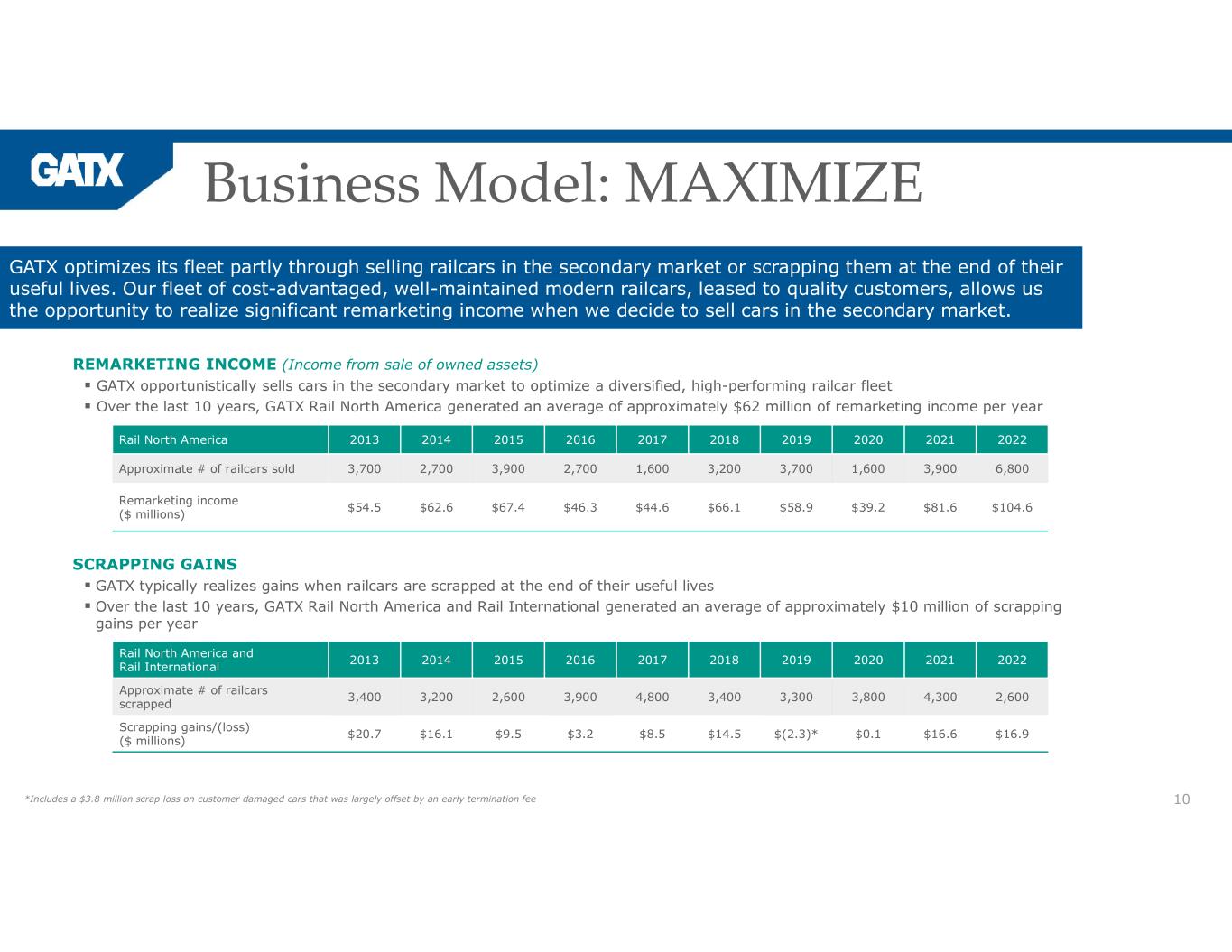 9 Proven Business Model BUY the railcar at an economically attractive and competitively advantaged price at the right time LEASE the railcar to a quality customer at an attractive rate for a term that reflects the business cycle SERVICE the railcar in a manner that maximizes safety, in-use time, and customer satisfaction MAXIMIZE the value of the railcar by selling or scrapping at the optimal time