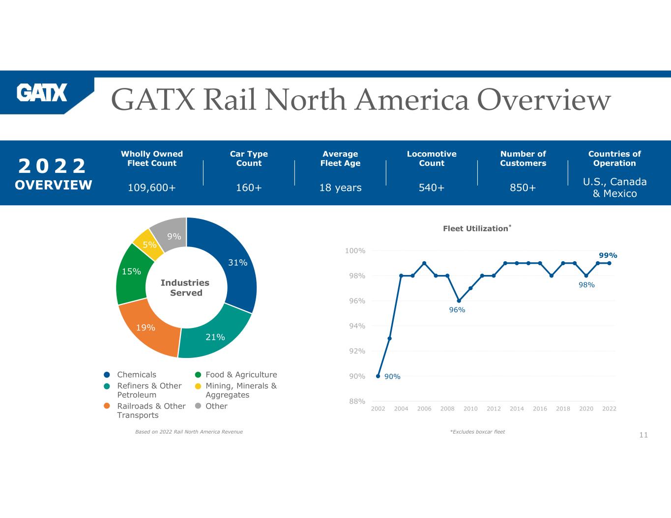 REMARKETING INCOME (Income from sale of owned assets) GATX opportunistically sells cars in the secondary market to optimize a diversified, high-performing railcar fleet Over the last 10 years, GATX Rail North America generated an average of approximately $62 million of remarketing income per year SCRAPPING GAINS GATX typically realizes gains when railcars are scrapped at the end of their useful lives Over the last 10 years, GATX Rail North America and Rail International generated an average of approximately $10 million of scrapping gains per year 10 Rail North America and Rail International 2013 2014 2015 2016 2017 2018 2019 2020 2021 2022 Approximate # of railcars scrapped 3,400 3,200 2,600 3,900 4,800 3,400 3,300 3,800 4,300 2,600 Scrapping gains/(loss) ($ millions) $20.7 $16.1 $9.5 $3.2 $8.5 $14.5 $(2.3)* $0.1 $16.6 $16.9 Rail North America 2013 2014 2015 2016 2017 2018 2019 2020 2021 2022 Approximate # of railcars sold 3,700 2,700 3,900 2,700 1,600 3,200 3,700 1,600 3,900 6,800 Remarketing income ($ millions) $54.5 $62.6 $67.4 $46.3 $44.6 $66.1 $58.9 $39.2 $81.6 $104.6 Business Model: MAXIMIZE *Includes a $3.8 million scrap loss on customer damaged cars that was largely offset by an early termination fee GATX optimizes its fleet partly through selling railcars in the secondary market or scrapping them at the end of their useful lives. Our fleet of cost-advantaged, well-maintained modern railcars, leased to quality customers, allows us the opportunity to realize significant remarketing income when we decide to sell cars in the secondary market.