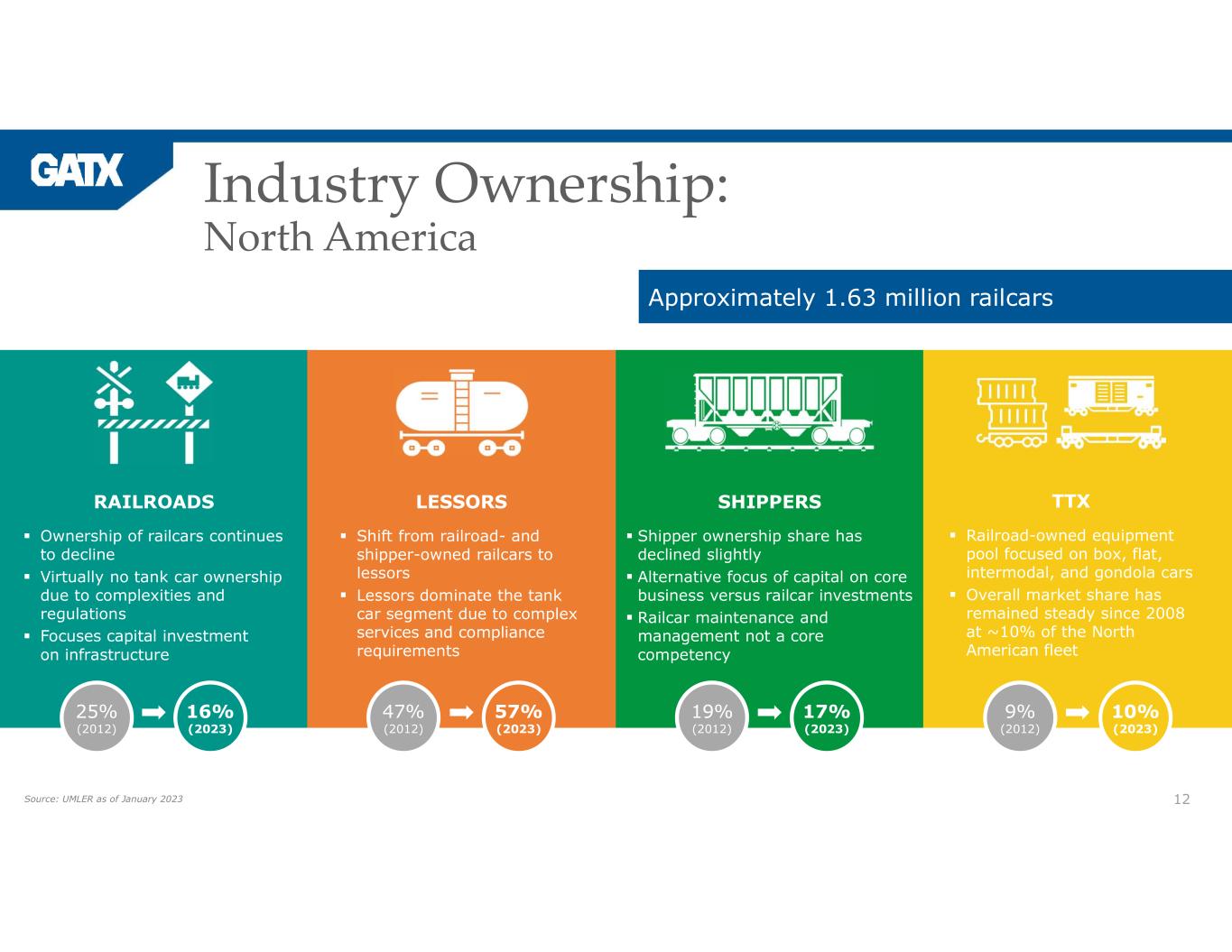 GATX Rail North America Overview 2 0 2 2 OVERVIEW Wholly Owned Fleet Count Car Type Count Average Fleet Age Locomotive Count Number of Customers Countries of Operation 109,600+ 160+ 18 years 540+ 850+ U.S., Canada & Mexico 31% 21% 19% 15% 5% 9% Chemicals Refiners & Other Petroleum Railroads & Other Transports Food & Agriculture Mining, Minerals & Aggregates Other Based on 2022 Rail North America Revenue Industries Served 88% 90% 92% 94% 96% 98% 100% 2002 2004 2006 2008 2010 2012 2014 2016 2018 2020 2022 90% 98% Fleet Utilization* *Excludes boxcar fleet 11 99% 96%