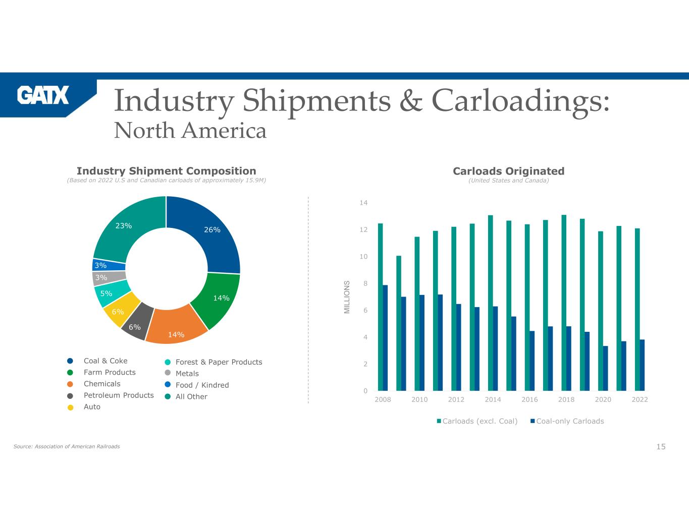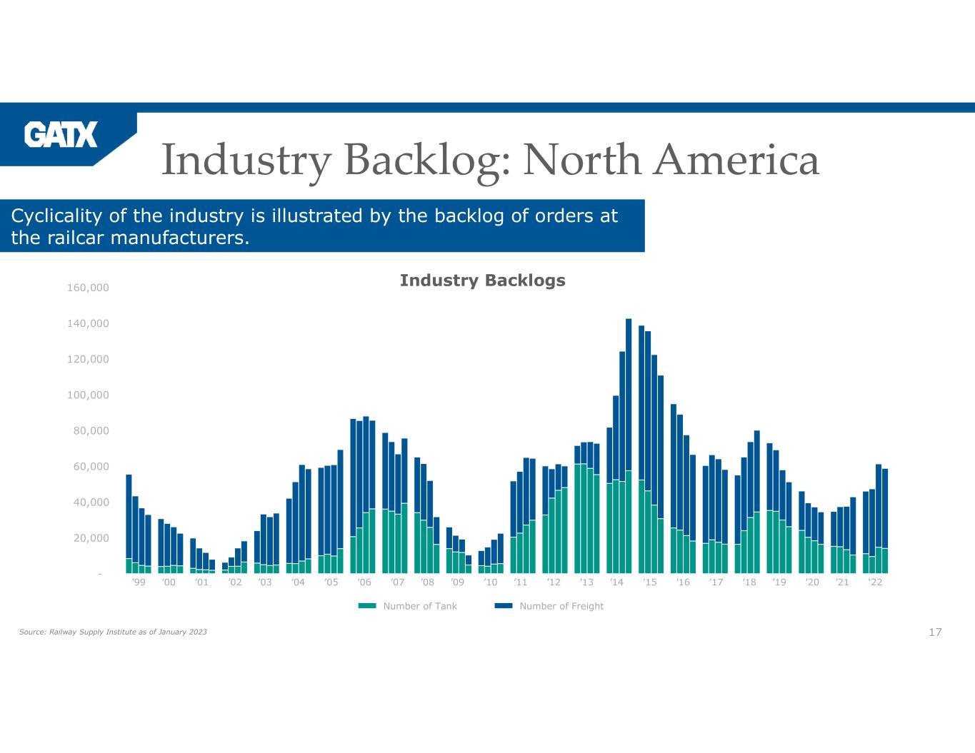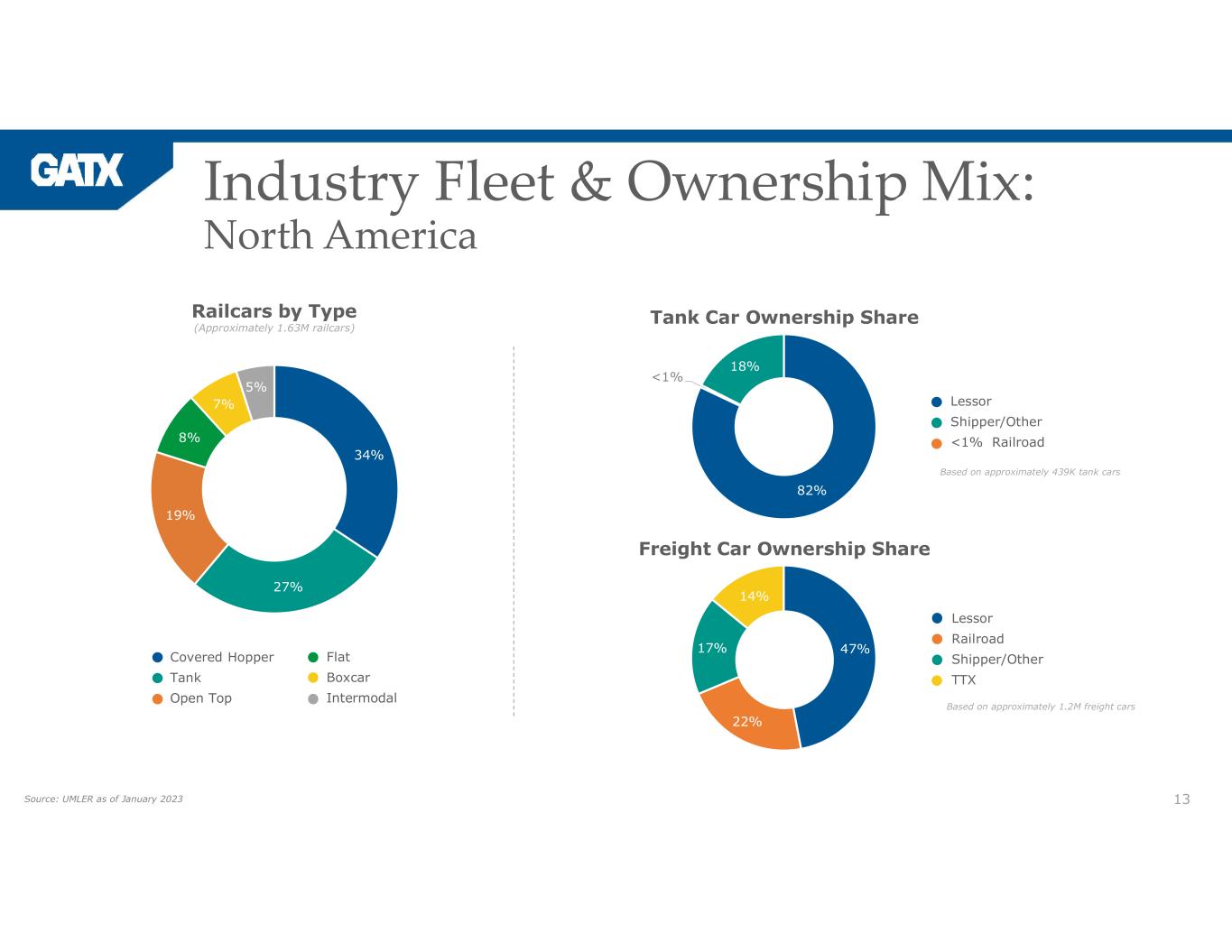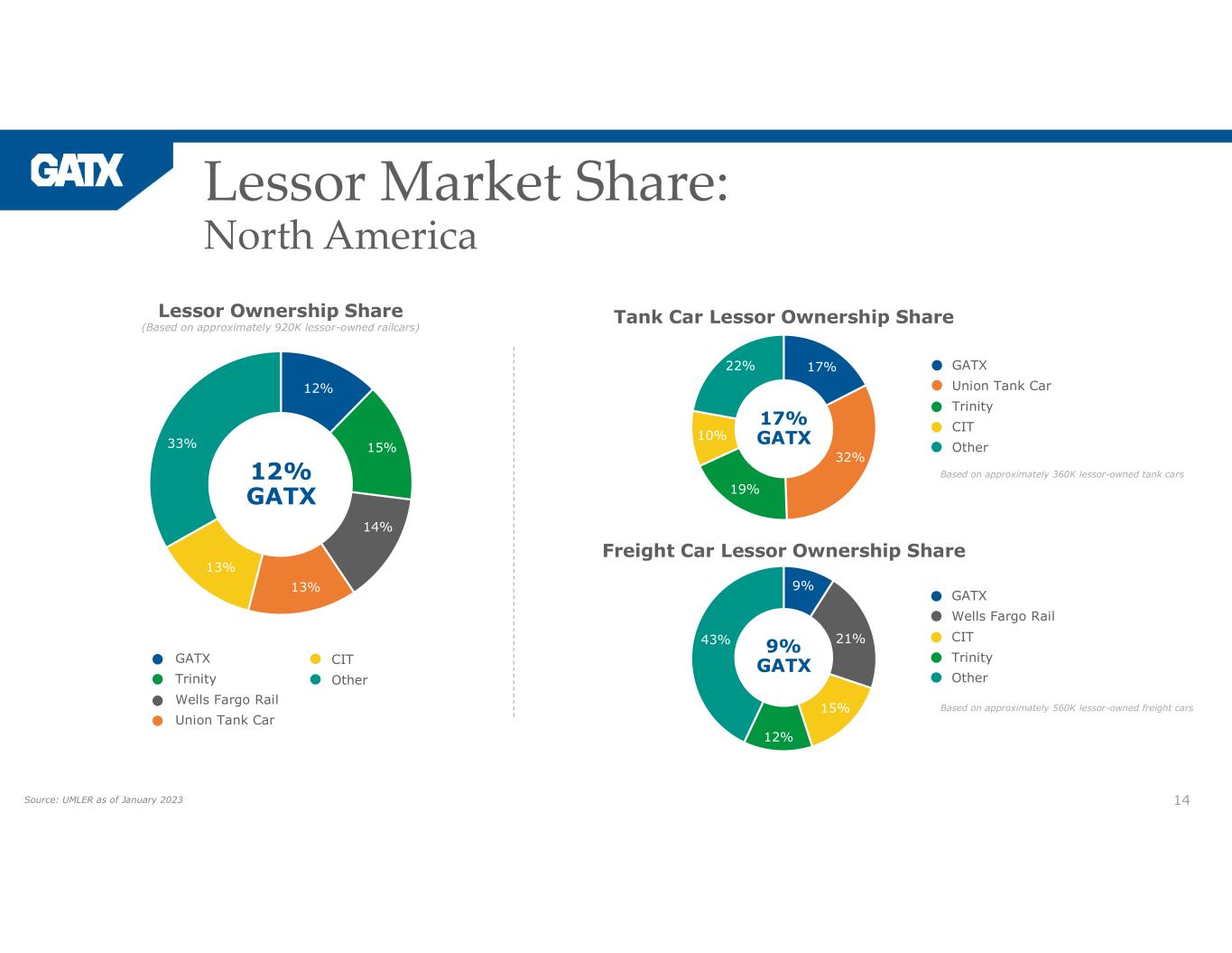 Based on approximately 360K lessor-owned tank cars Based on approximately 560K lessor-owned freight cars Lessor Ownership Share (Based on approximately 920K lessor-owned railcars) Tank Car Lessor Ownership Share Freight Car Lessor Ownership Share Lessor Market Share: North America Source: UMLER as of January 2023 12% 15% 14% 13% 13% 33% 12% GATX GATX Trinity Wells Fargo Rail Union Tank Car CIT Other 17% 32% 19% 10% 22% 17% GATX GATX Union Tank Car Trinity CIT Other GATX Wells Fargo Rail CIT Trinity Other 9% 21% 15% 12% 43% 9% GATX 14